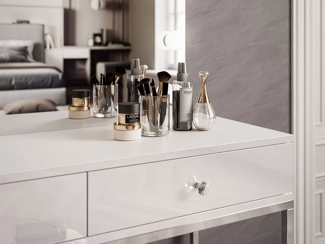 W toaletce kosmetycznej Brisa znajdziemy kilka bardzo praktycznych rozwiązań, jak choćby wspomniane wcześniej lustro z oświetleniem LED. Umieszczono tu 12 punktów świetlnych o naturalnej barwie, która nie męczy oczu. Oświetlenie zasilane jest z gniazdka sieciowego, za pośrednictwem dołączonego do zestawu przewodu. Toaletka jest zaopatrzona ponadto w dwie szuflady otwierane za kryształowych uchwytów, a prowadnice kulkowe zapewniają pełny wysuw.