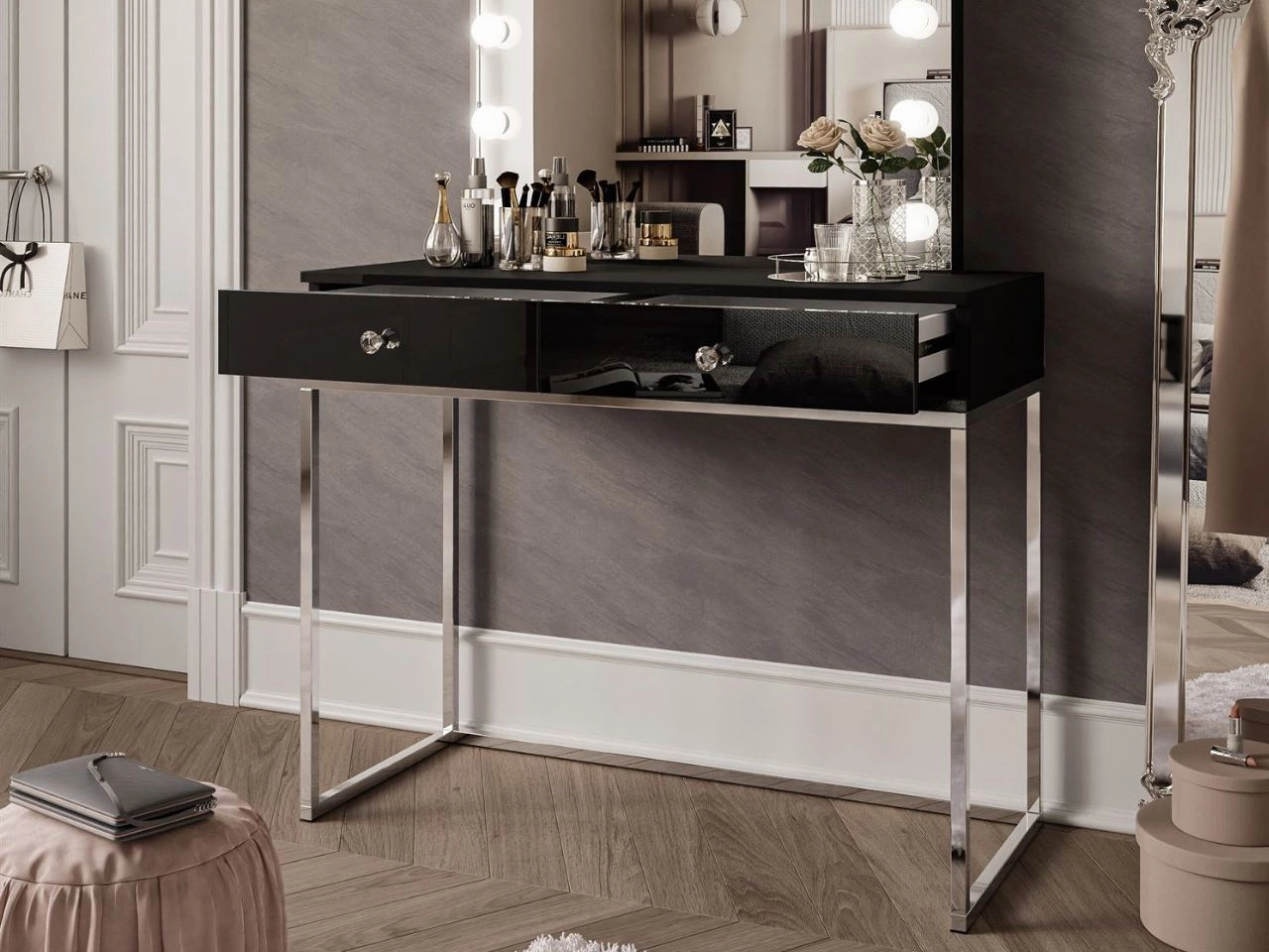 Czarna toaletka z lustrem i oświetleniem LED Brisa to bardzo estetycznie wykonany mebel, który świetnie wpasuje się w najróżniejsze aranżacje. Korpus mebla i ramę lustra wykonano z matowej płyty laminowanej. Fronty natomiast wykończono w wysokim połysku. Całość ustawiona jest na srebrnym metalowym stelażu, który nie tylko dobrze wygląda, ale również zapewnia odpowiednią stabilność konstrukcji.