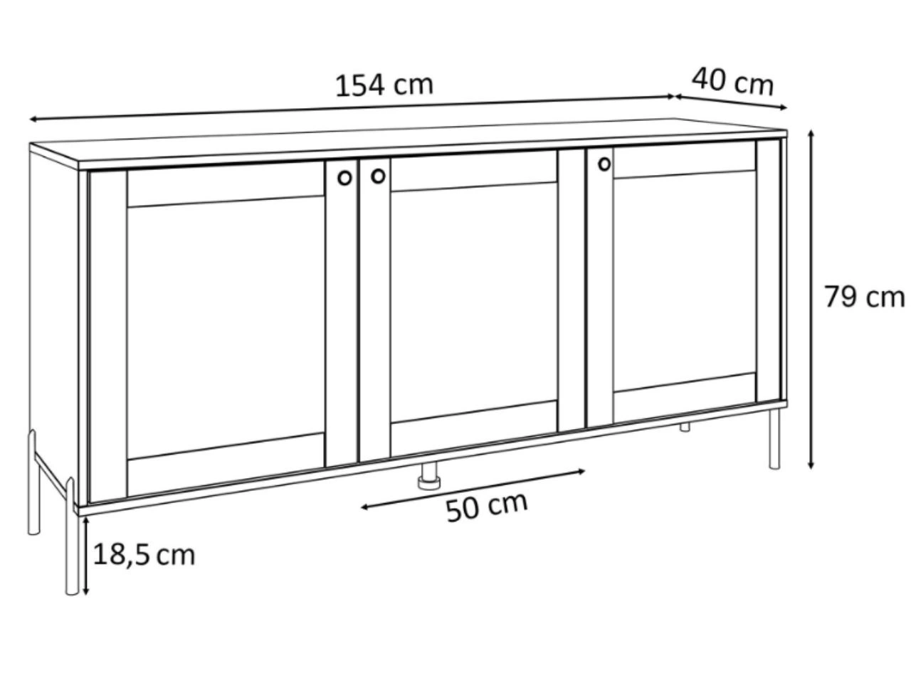 Trzydrzwiowa komoda Bellance w odcieniu dąb puccini zwraca uwagę przede wszystkim swoim frontem, którego powierzchnię pokryto okleiną z nadrukiem trzcinowej plecionki, która wprost nawiązuje do stylu wiedeńskiego. Wzrok przyciągają również subtelne metalowe uchwyty w czarnym kolorze. Całość ustawiono na stylowych czarnych nóżkach wykonanych z metalu.