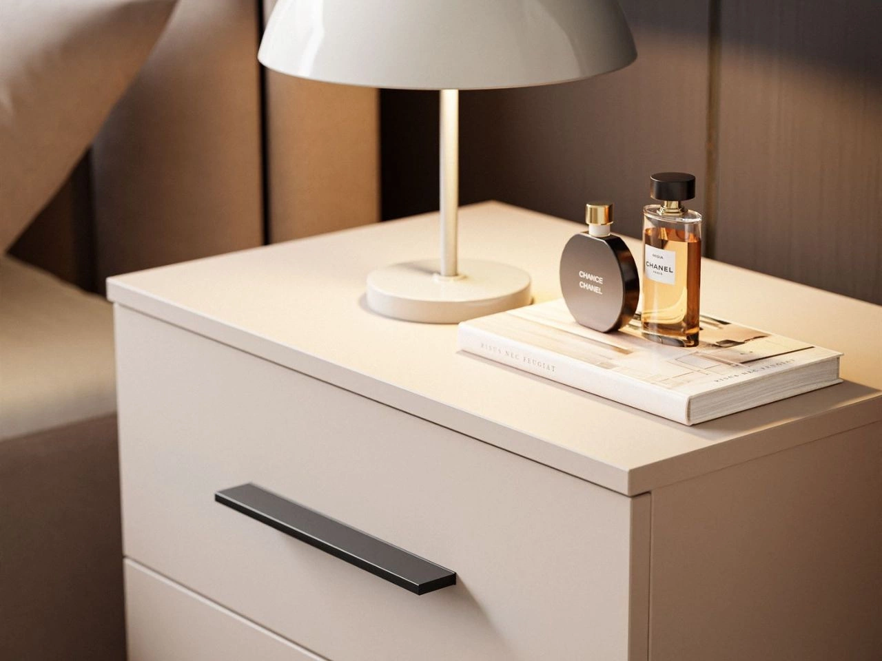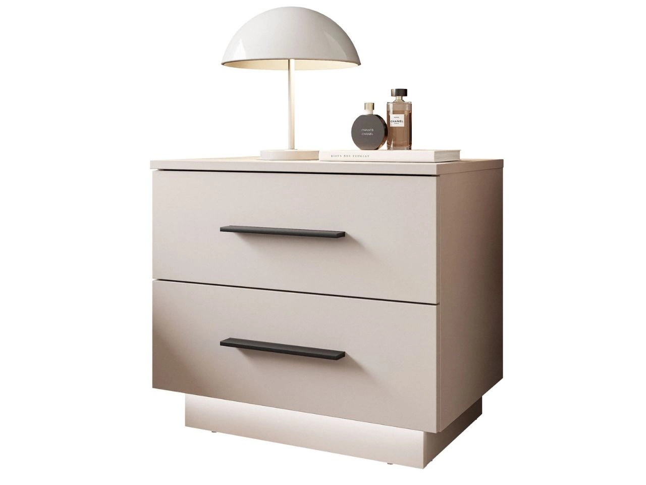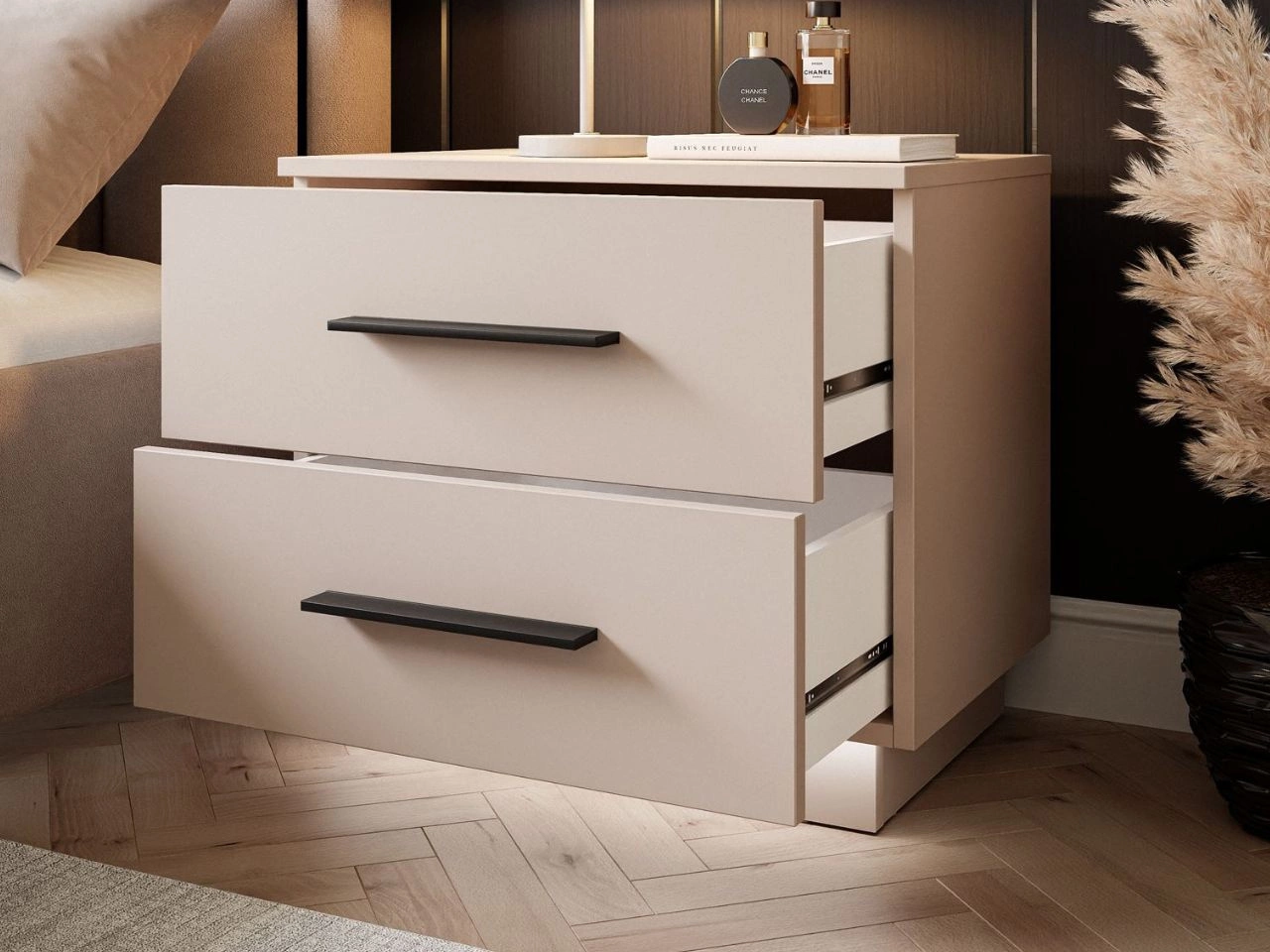 Szafkę nocną wykonano z wytrzymałej matowej płyty laminowanej, co podkreśla elegancki charakter mebla i zwiększa jej odporność na użytkowanie. Czoła szuflad zabezpieczono obrzeżem ABS, które nadaje im estetyczne wykończenie oraz dodatkowo chroni krawędzie przed uszkodzeniami.  Szuflady osadzono na solidnych prowadnicach kulkowych, gwarantujących płynne i komfortowe otwieranie, a całość dopełniają ergonomiczne uchwyty, które zapewniają wygodne korzystanie z szuflad i stanowią subtelny detal dekoracyjny. Cokół cofnięty pod konstrukcją nadaje meblowi wizualnej lekkości oraz ułatwia utrzymanie czystości.