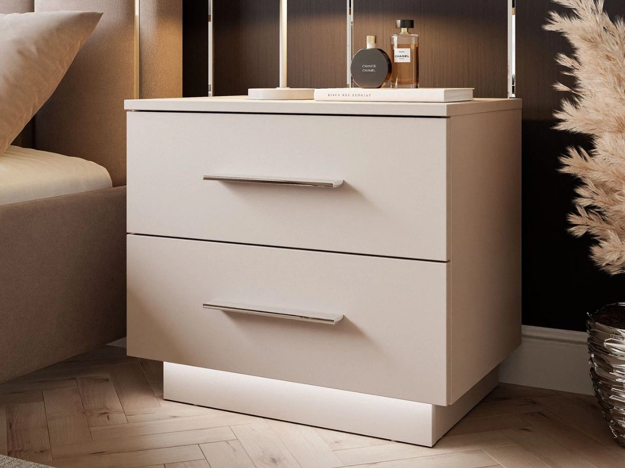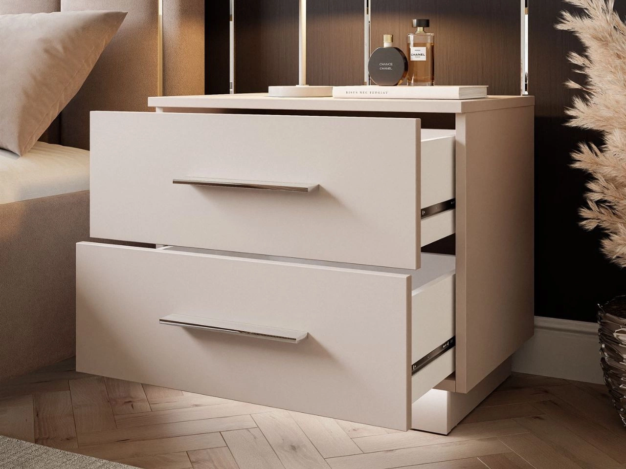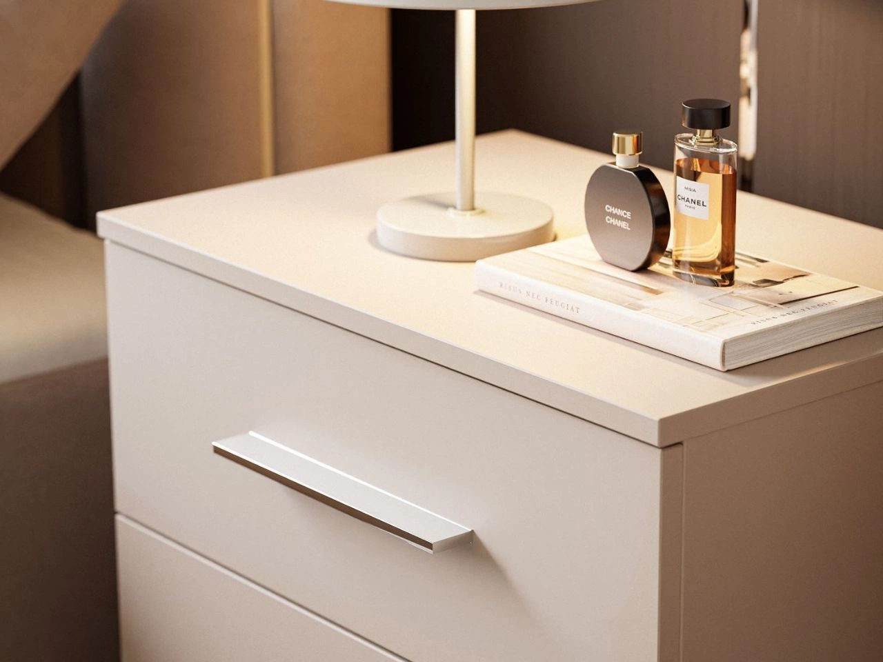 Szafkę nocną wykonano z wytrzymałej matowej płyty laminowanej, co podkreśla elegancki charakter mebla i zwiększa jej odporność na użytkowanie. Czoła szuflad zabezpieczono obrzeżem ABS, które nadaje im estetyczne wykończenie oraz dodatkowo chroni krawędzie przed uszkodzeniami. Szuflady osadzono na solidnych prowadnicach kulkowych, gwarantujących płynne i komfortowe otwieranie, a całość dopełniają ergonomiczne uchwyty, które zapewniają wygodne korzystanie z szuflad i stanowią subtelny detal dekoracyjny. Cokół cofnięty pod konstrukcją nadaje meblowi wizualnej lekkości oraz ułatwia utrzymanie czystości.