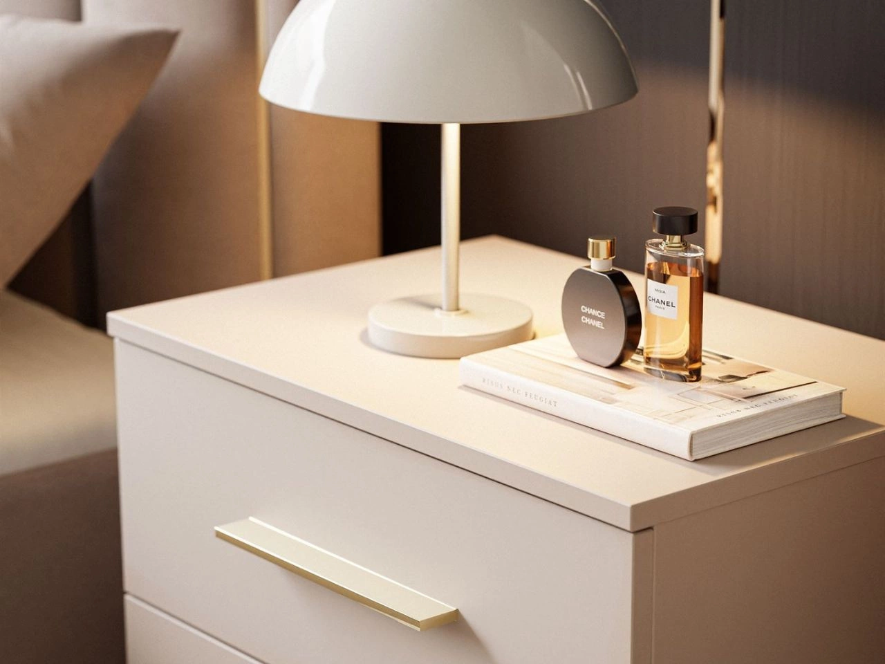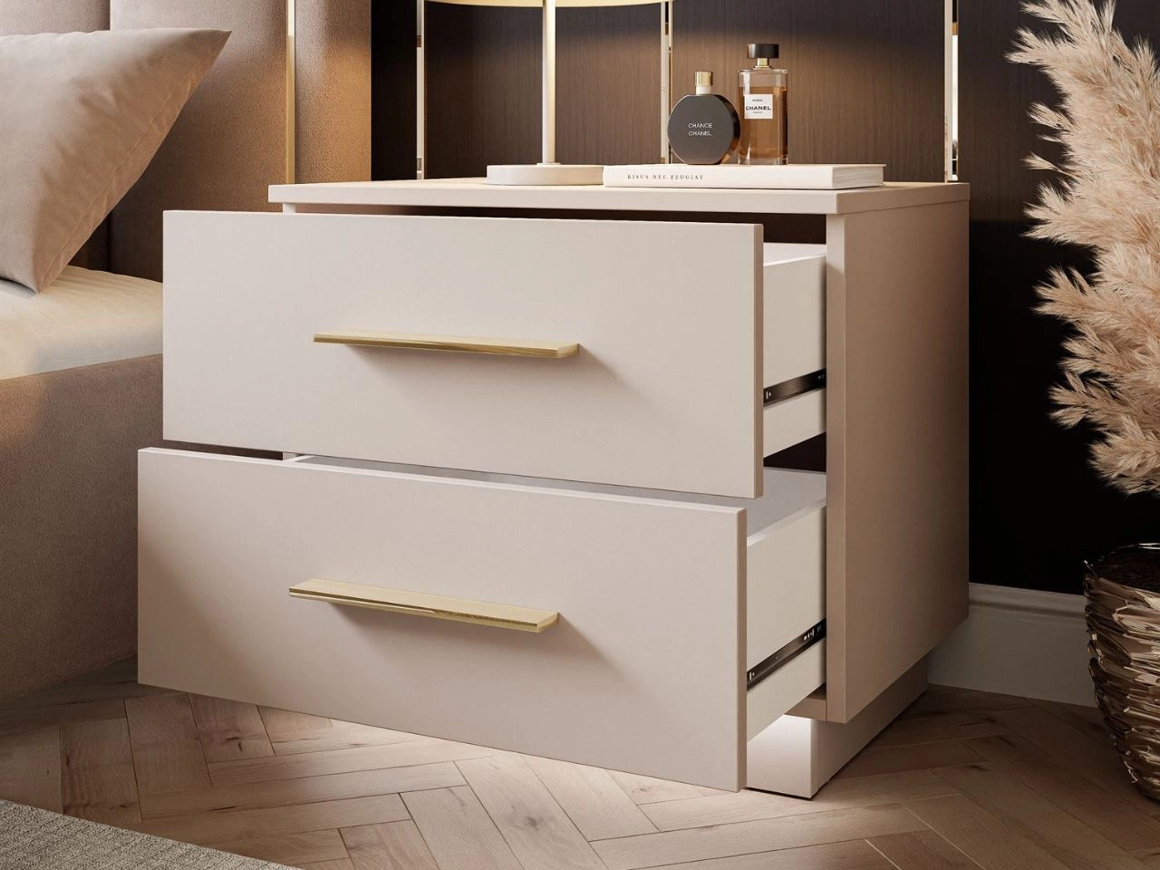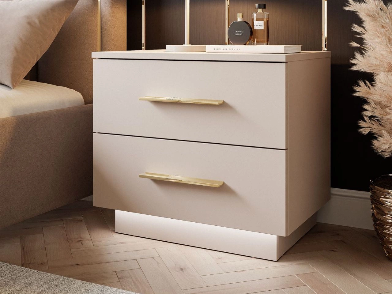 Szafkę nocną wykonano z wytrzymałej matowej płyty laminowanej, co podkreśla elegancki charakter mebla i zwiększa jej odporność na użytkowanie. Czoła szuflad zabezpieczono obrzeżem ABS, które nadaje im estetyczne wykończenie oraz dodatkowo chroni krawędzie przed uszkodzeniami. Szuflady osadzono na solidnych prowadnicach kulkowych, gwarantujących płynne i komfortowe otwieranie, a całość dopełniają ergonomiczne uchwyty, które zapewniają wygodne korzystanie z szuflad i stanowią subtelny detal dekoracyjny. Cokół cofnięty pod konstrukcją nadaje meblowi wizualnej lekkości oraz ułatwia utrzymanie czystości.