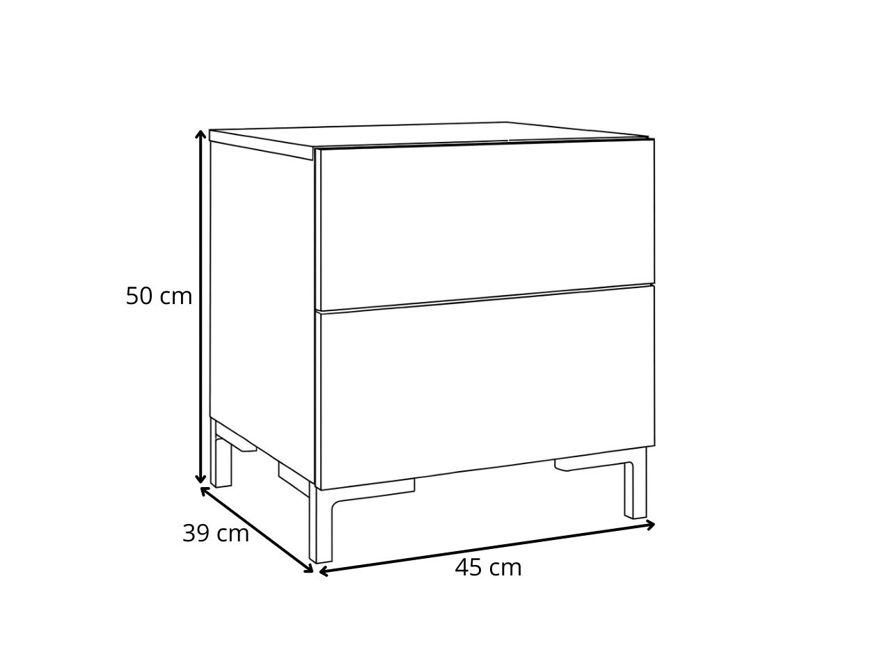 Szafkę nocną wykonano z wytrzymałej płyty laminowanej, co podkreśla elegancki charakter mebla i zwiększa jej odporność na użytkowanie. Czoła szuflad zabezpieczono obrzeżem ABS, które nadaje im estetyczne wykończenie oraz dodatkowo chroni krawędzie przed uszkodzeniami. Szuflady osadzono na solidnych prowadnicach kulkowych, gwarantujących płynne i komfortowe otwieranie. Zastosowane uchwyty umożliwiają wygodne otwieranie frontów, podkreślając nowoczesny charakter mebla i wpisując się w aktualne trendy wzornictwa. Konstrukcję podtrzymują nogi, nadające całości lekkości i ułatwiające sprzątanie.