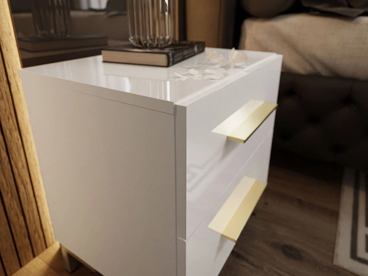 Dobierasz do: Stolik nocny z dwoma szufladami na złotych nogach Nuveo Lux Biały Połysk