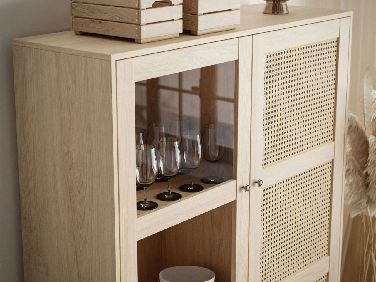 Witryna Bellance w pierwszej kolejności przyciąga wzrok projektem swoich frontów; prawe drzwi posiadają trzy panele wykonane z okleiny imitującej trzcinową plecionkę. Lewe drzwi posiadają takie samo wykończenie w dolnej części. Dwa górne segmenty zostały natomiast przeszklone, dzięki czemu bez problemu wyeksponujemy i uwidocznimy przedmioty ustawione na półkach we wnętrzu witryny.