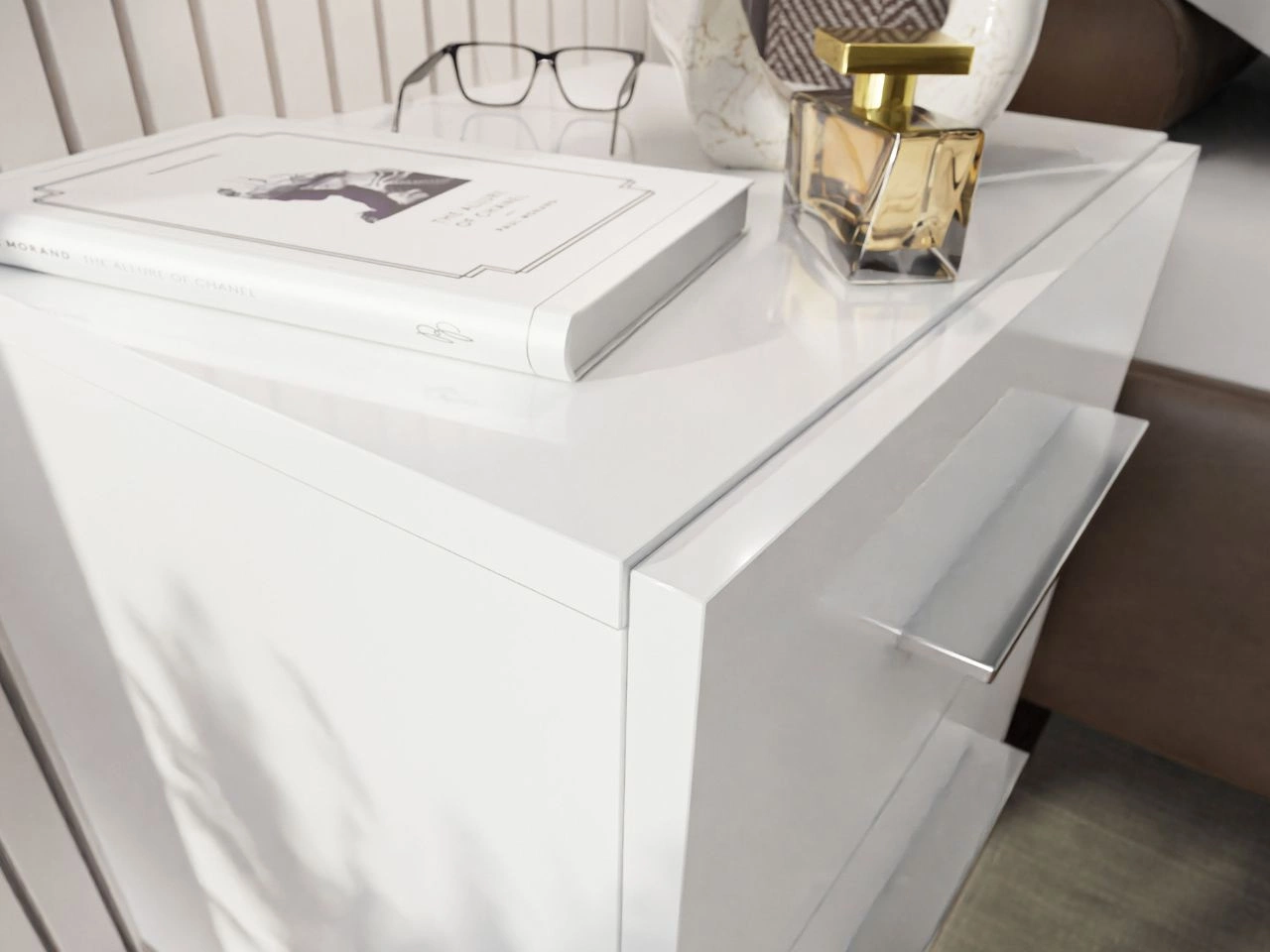 Szafkę nocną wykonano z wytrzymałej płyty laminowanej, a jej fronty powstały w wysokim połysku, co podkreśla elegancki charakter mebla i zwiększa jej odporność na użytkowanie. Czoła szuflad zabezpieczono obrzeżem ABS, które nadaje im estetyczne wykończenie oraz dodatkowo chroni krawędzie przed uszkodzeniami. Szuflady osadzono na solidnych prowadnicach kulkowych, gwarantujących płynne i komfortowe otwieranie. Zastosowane uchwyty umożliwiają wygodne otwieranie frontów, podkreślając nowoczesny charakter mebla i wpisując się w aktualne trendy wzornictwa. Podwieszana konstrukcja stolika nocnego dodaje mu lekkości i elegancji, a jednocześnie ułatwia utrzymanie porządku w przestrzeni pod nim.
