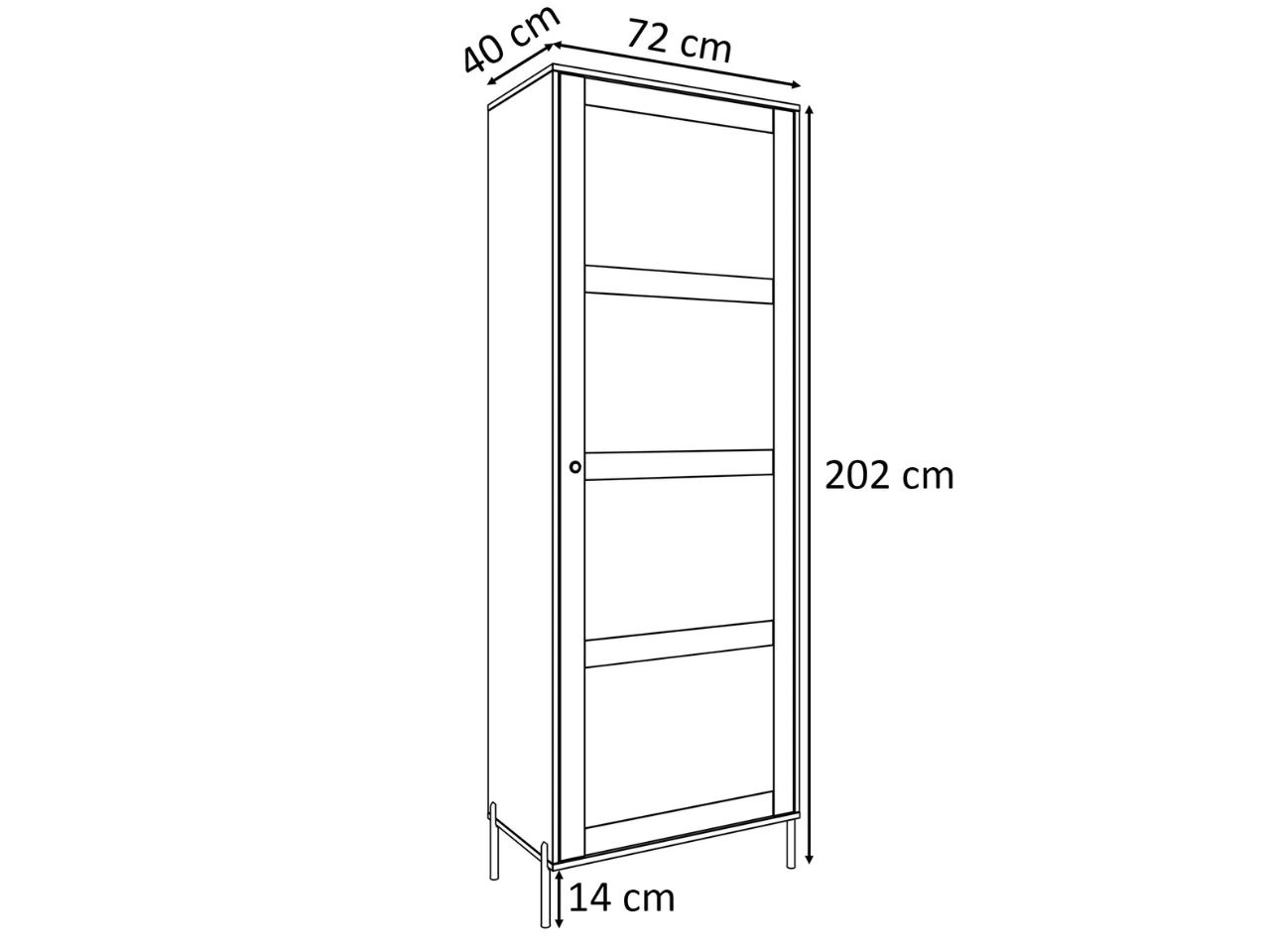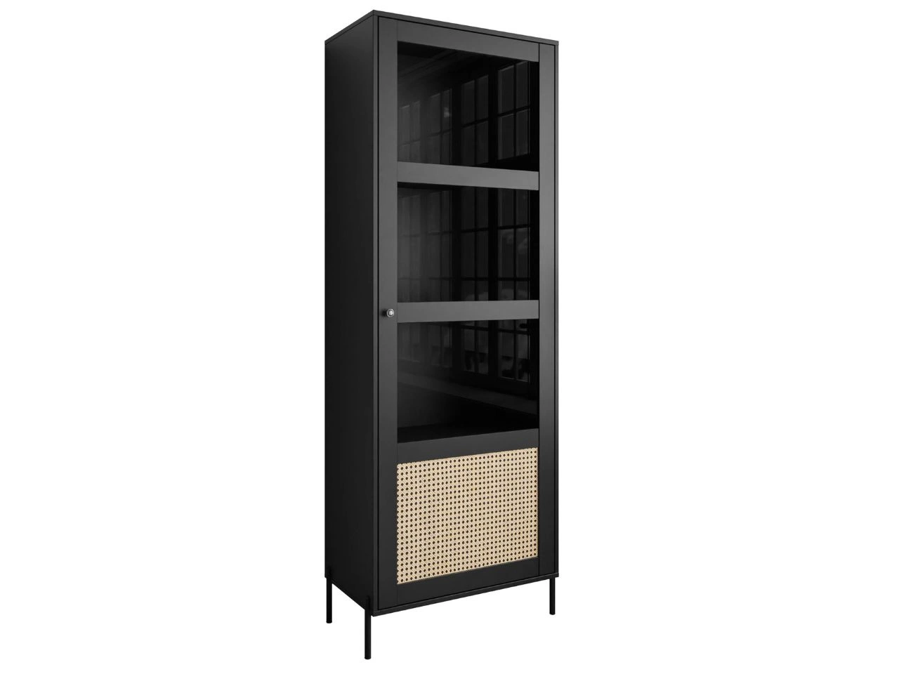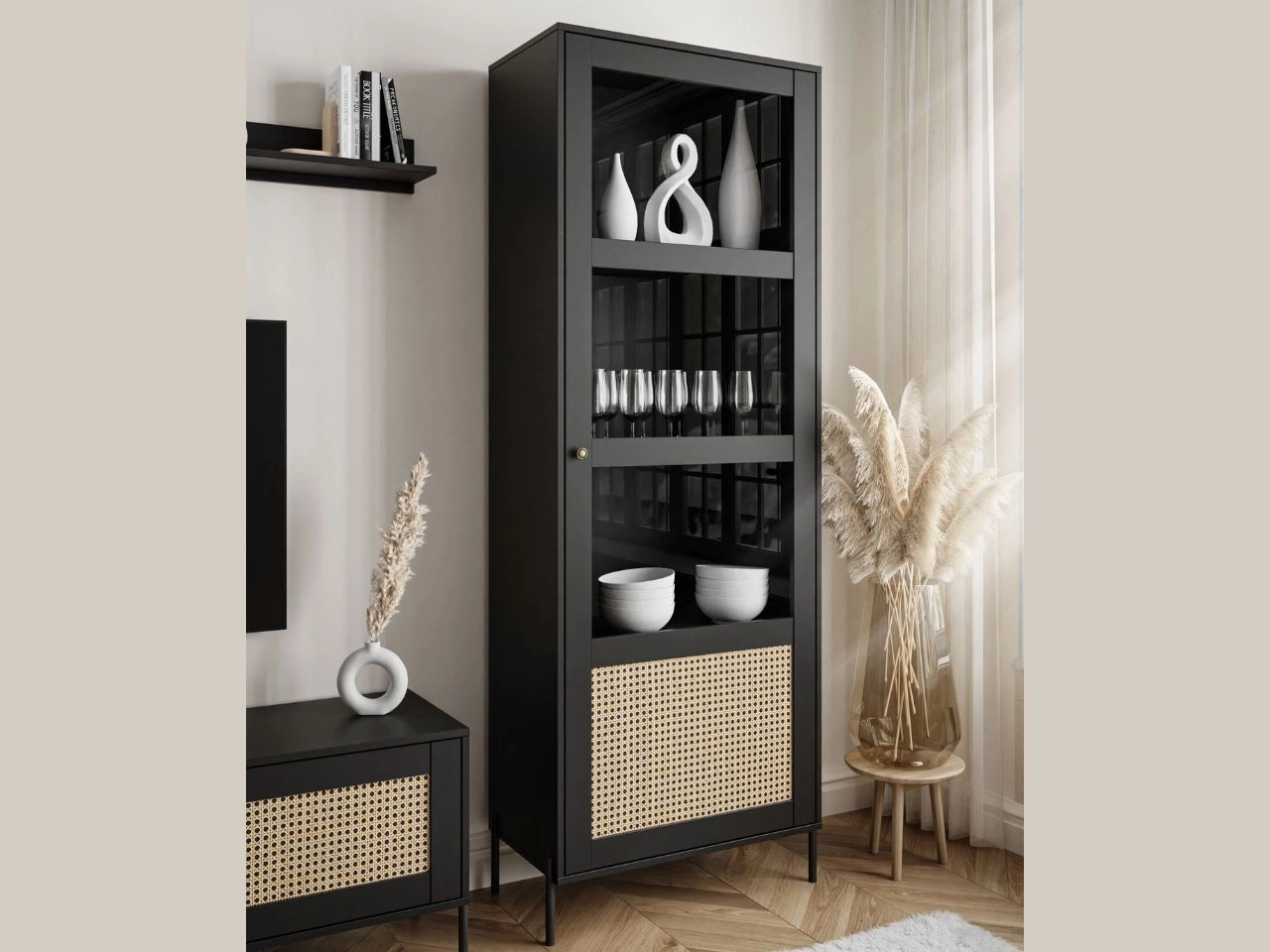 Witryna wysoka Bellance w pierwszej kolejności przyciąga wzrok projektem swojego frontu, gdzie w dolnej części widzimy fragment pokryty okleiną imitującą trzcinową plecionkę, podczas gdy górna część jest w pełni przeszklona i pozwala na efektowne wyeksponowanie przedmiotów ustawionych na półkach we wnętrzu mebla.