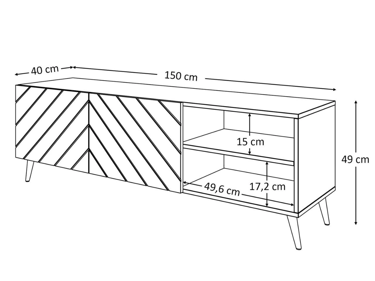 Dzięki połączeniu designu premium i praktycznych rozwiązań, szafka RTV Vionel wprowadzi do Twojego salonu styl i funkcjonalność. Mebel wykonano z odpornej na uszkodzenia płyty laminowanej, a jego frezowane fronty w połysku pięknie komponują się z matowym korpusem. Konstrukcję dopełniają metalowe nóżki w kolorze czarnym, które podkreślają nowoczesny styl i nadają całemu meblowi lekkości.