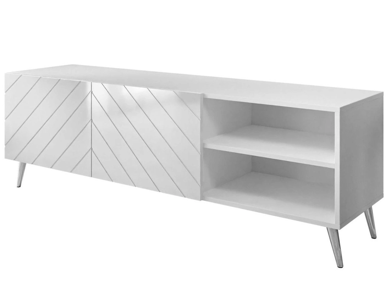 Szafka RTV z frezowanymi frontami i metalowymi chromowanymi nóżkami Vionel biały połysk