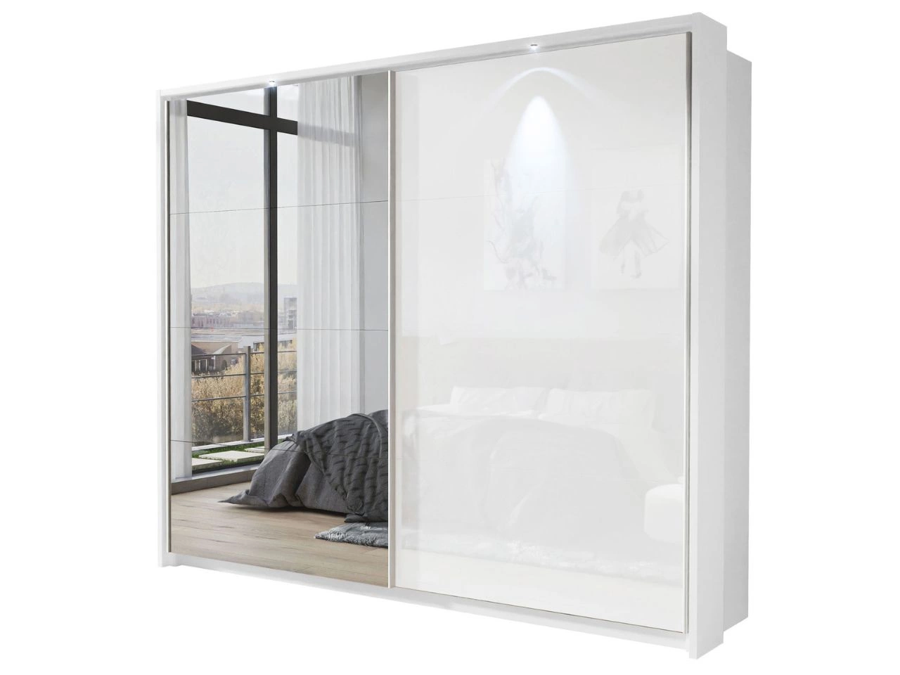 - jedno skrzydło z lustrem, drugie w białym wysokim połysku