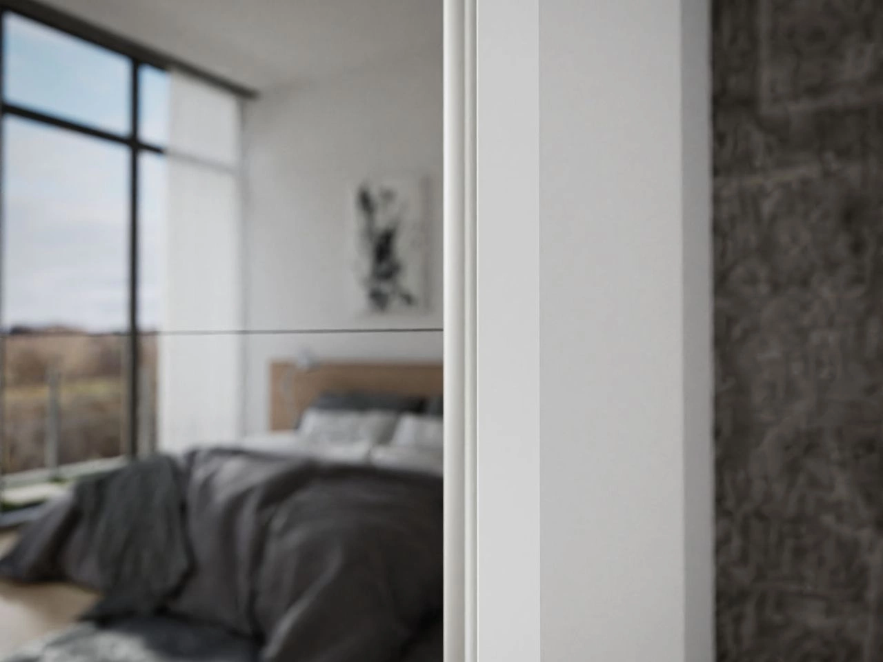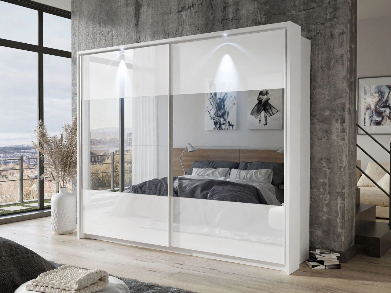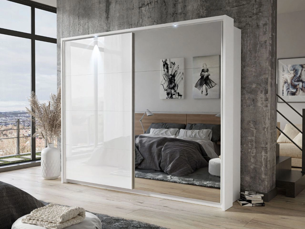 Ta nowoczesna szafa z drzwiami przesuwnymi doskonale wpasuje się zarówno do sypialni, jak i pokoju dziennego. Jedno skrzydło szafy pokryto lustrem, co optycznie powiększa przestrzeń i nadaje wnętrzu głębi, a drugie wykończono w białym wysokim połysku, tworząc efektowny kontrast i podkreślając nowoczesny charakter mebla. Dzięki solidnym prowadnicom drzwi przesuwają się płynnie i cicho, oszczędzając miejsce i ułatwiając codzienne użytkowanie.