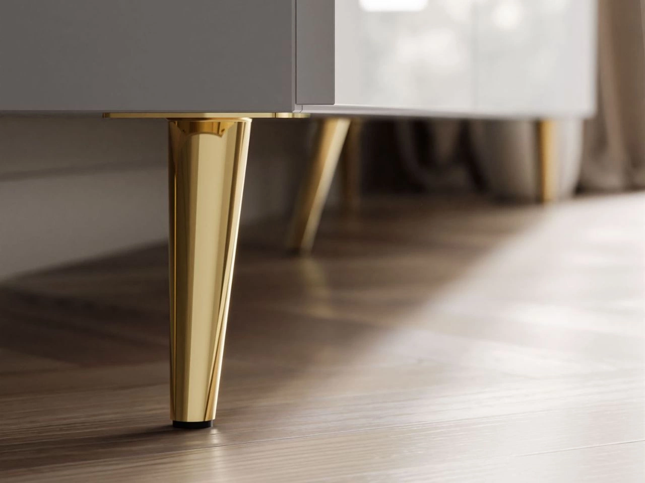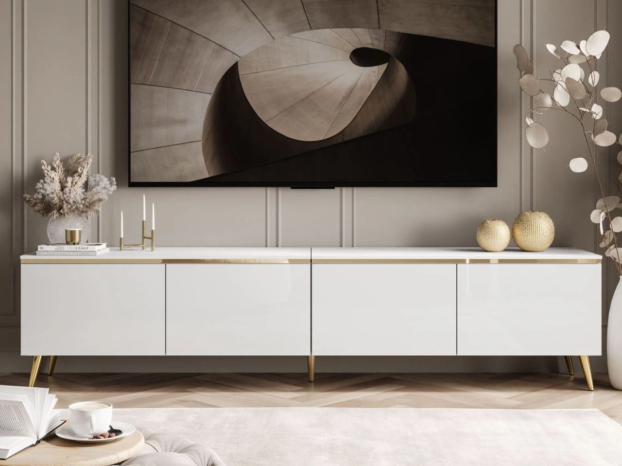 Szafka RTV czterodrzwiowa Celle to minimalistyczny model, który idealnie wpasuje się zarówno w stylistykę nowoczesną, jak i tą utrzymaną w duchu glamour. Model ten wykonany został z wysokiej jakości płyty laminowanej - wykończonej na wysoki połysk od frontu i matowej na blacie i korpusie. Stylistycznym smaczkiem są tu złote elementy pod postacią listwy ozdobnej w górnej części oraz metalowych nóżek w dolnej. Bez wątpienia dużym atutem jest oświetlenie LED, które montuje się pod szafką.