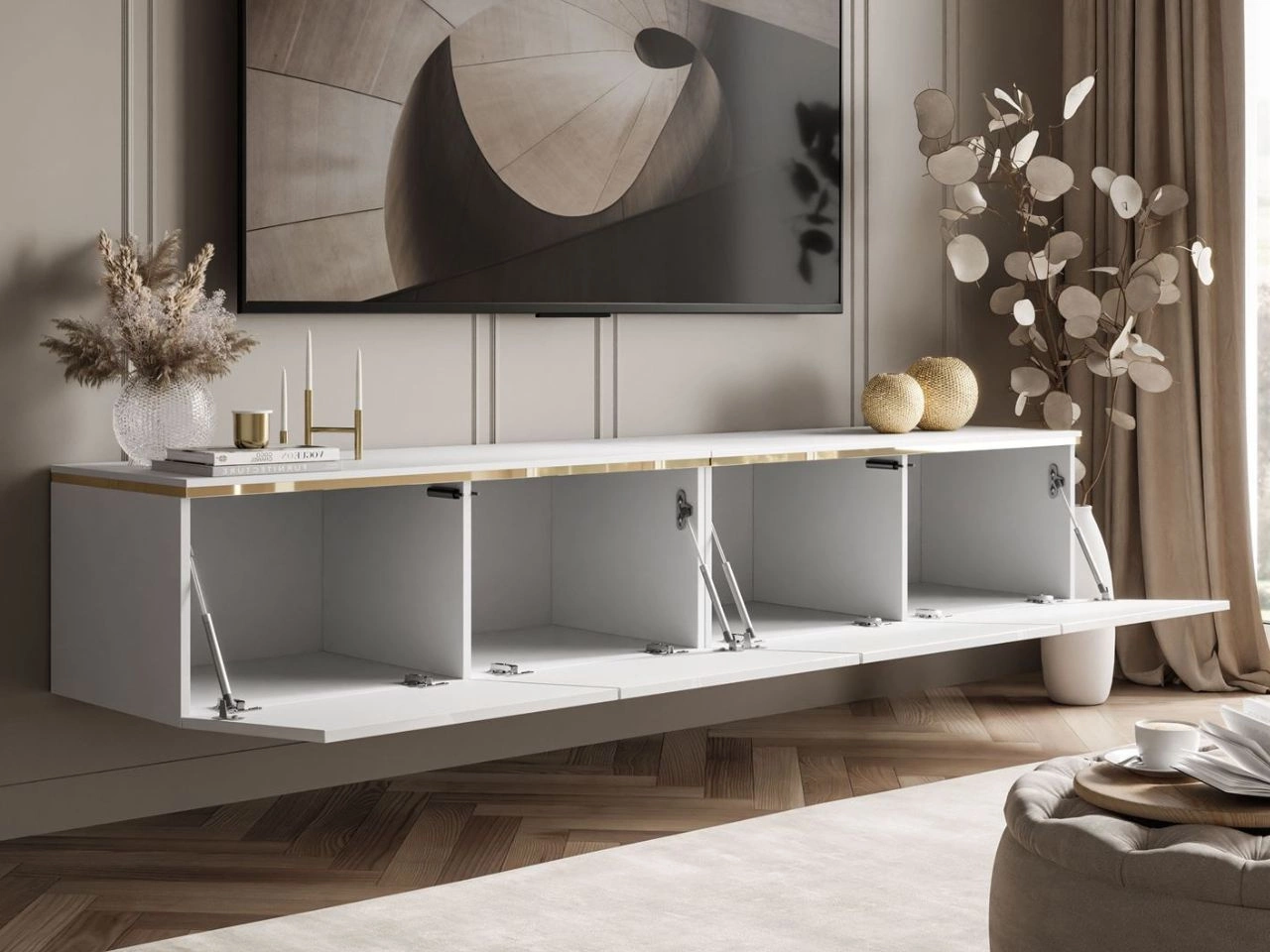 Wisząca szafka RTV czterodrzwiowa Celle to minimalistyczny model, który idealnie wpasuje się zarówno w stylistykę nowoczesną, jak i tą utrzymaną w duchu glamour. Model ten wykonany został z wysokiej jakości płyty laminowanej - wykończonej na wysoki połysk od frontu i matowej na blacie i korpusie. Stylistycznym smaczkiem jest tu złota listwa ozdobne w górnej części mebla.