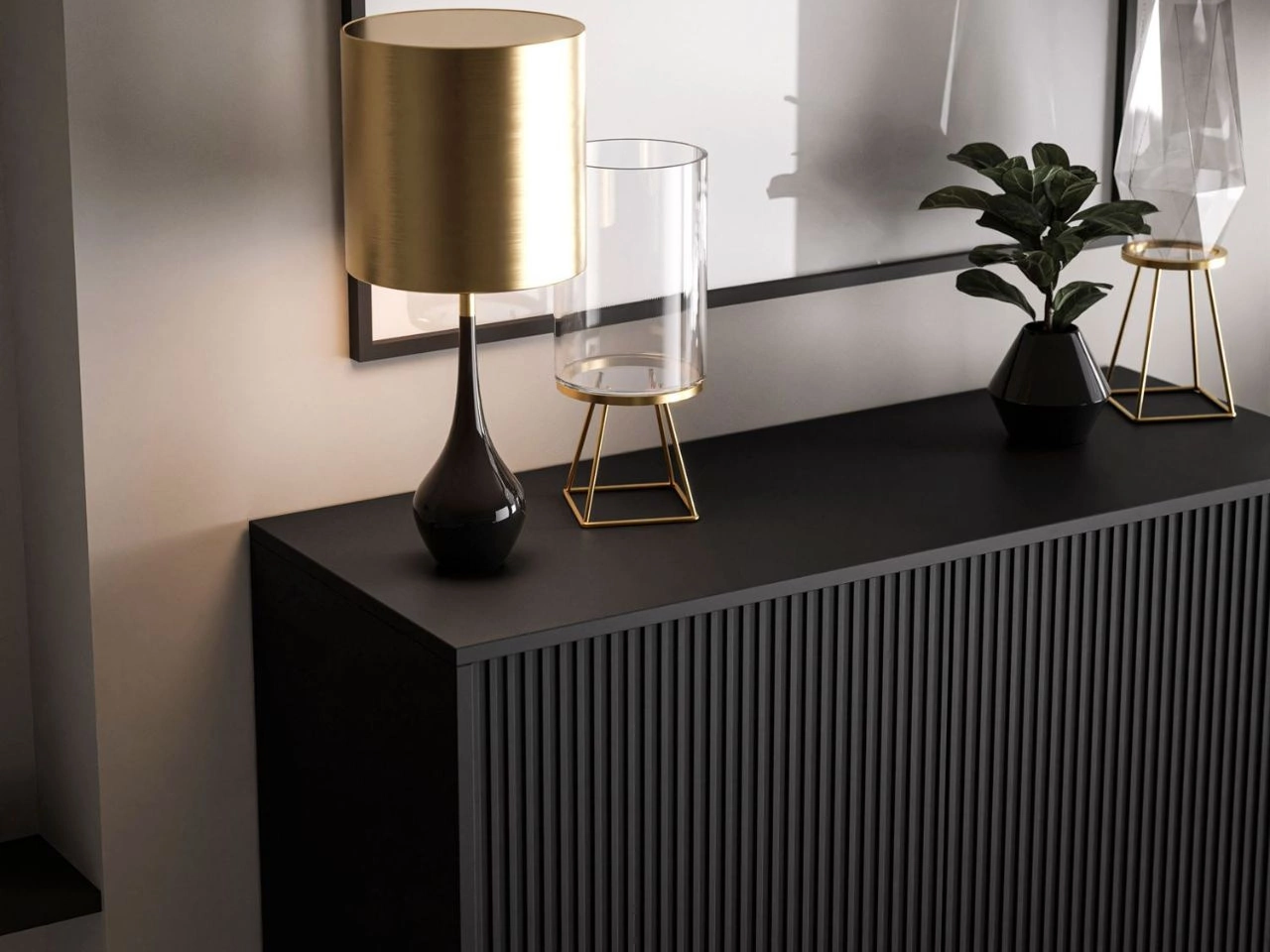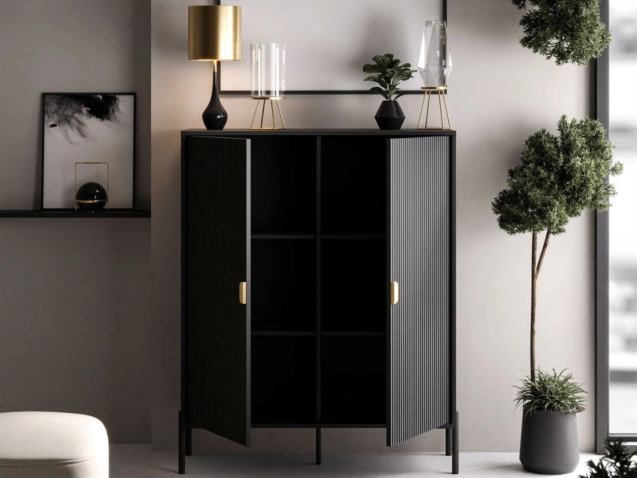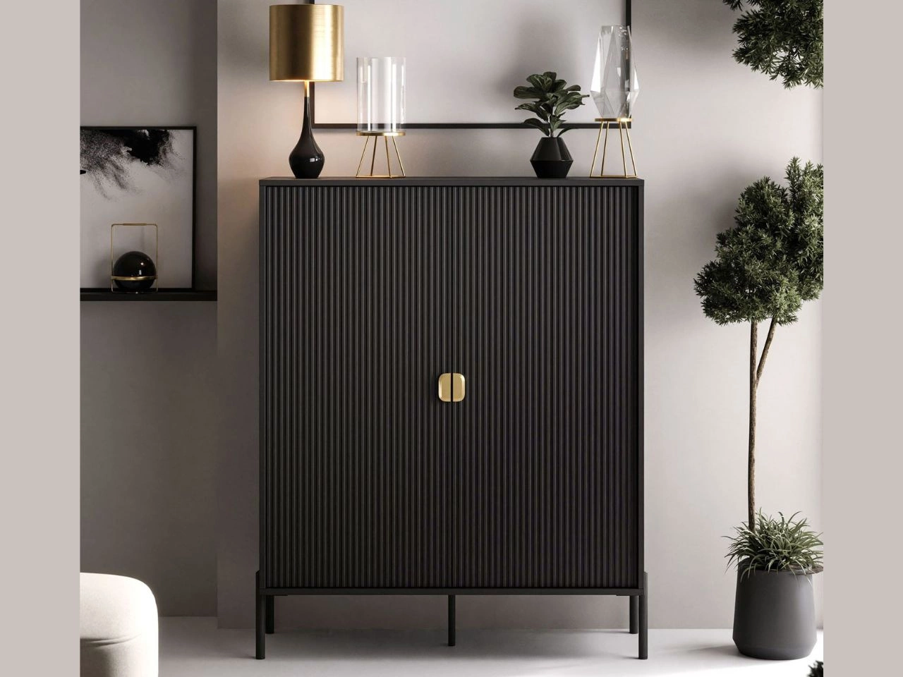 Dwudrzwiowa wysoka komoda Orlean wykonana została z dbałością o najdrobniejsze detale. Każdy element został tu dogłębnie przemyślany i zaprojektowany w taki sposób, aby idealnie pasować do całości. W pierwszej kolejności nasz wzrok przykuwają ryflowane fronty, na których wyraźnie swoją obecność zaznaczają złote półokrągłe uchwyty wykonane z metalu. w kolejnym rzucie oka zauważamy wysokie czarne nóżki. Wykonano je również z metalu, a ich smukłość nadaje meblowi wizualnej lekkości i czyni mebel bardzo przyjemnym w odbiorze.