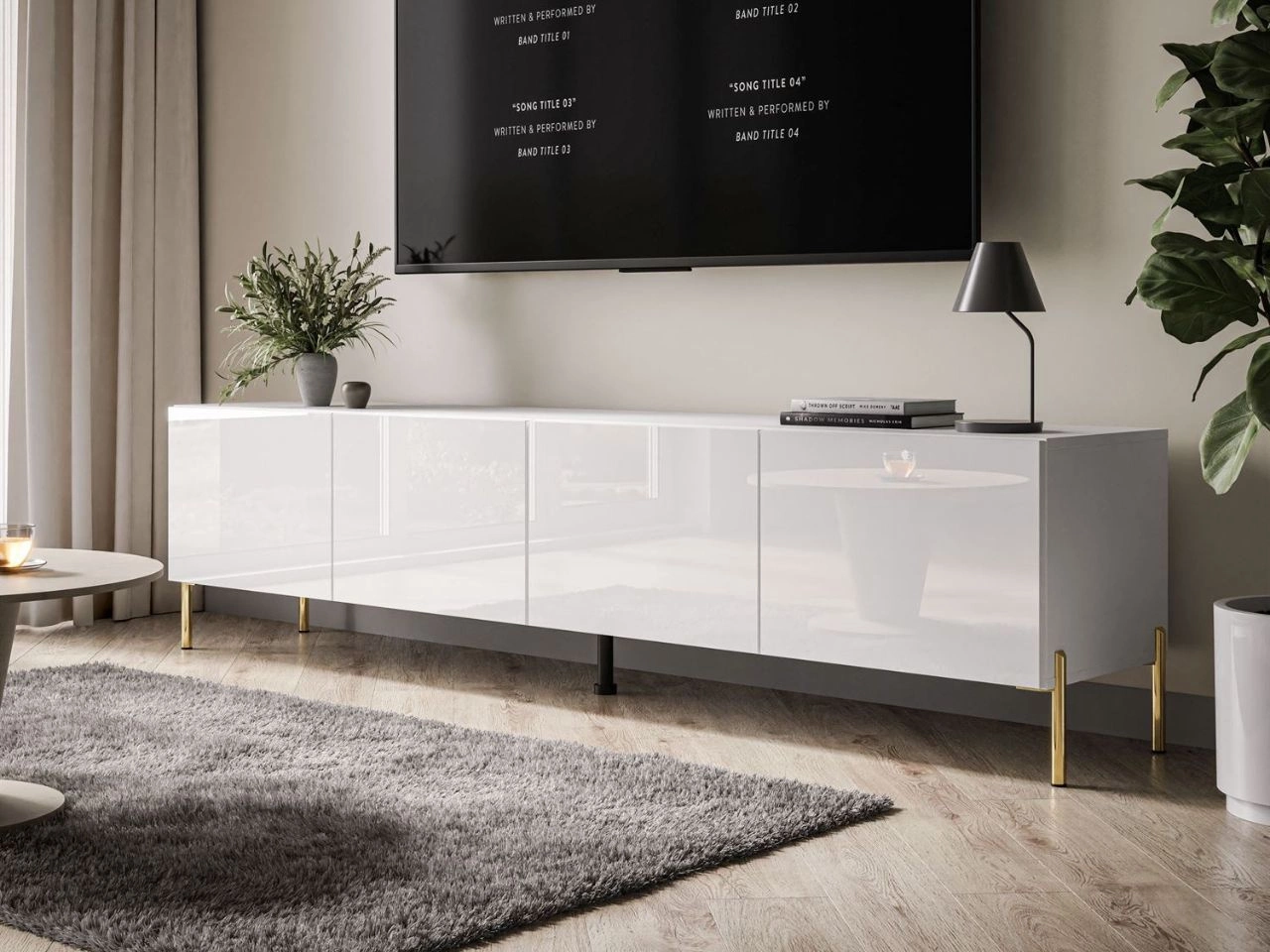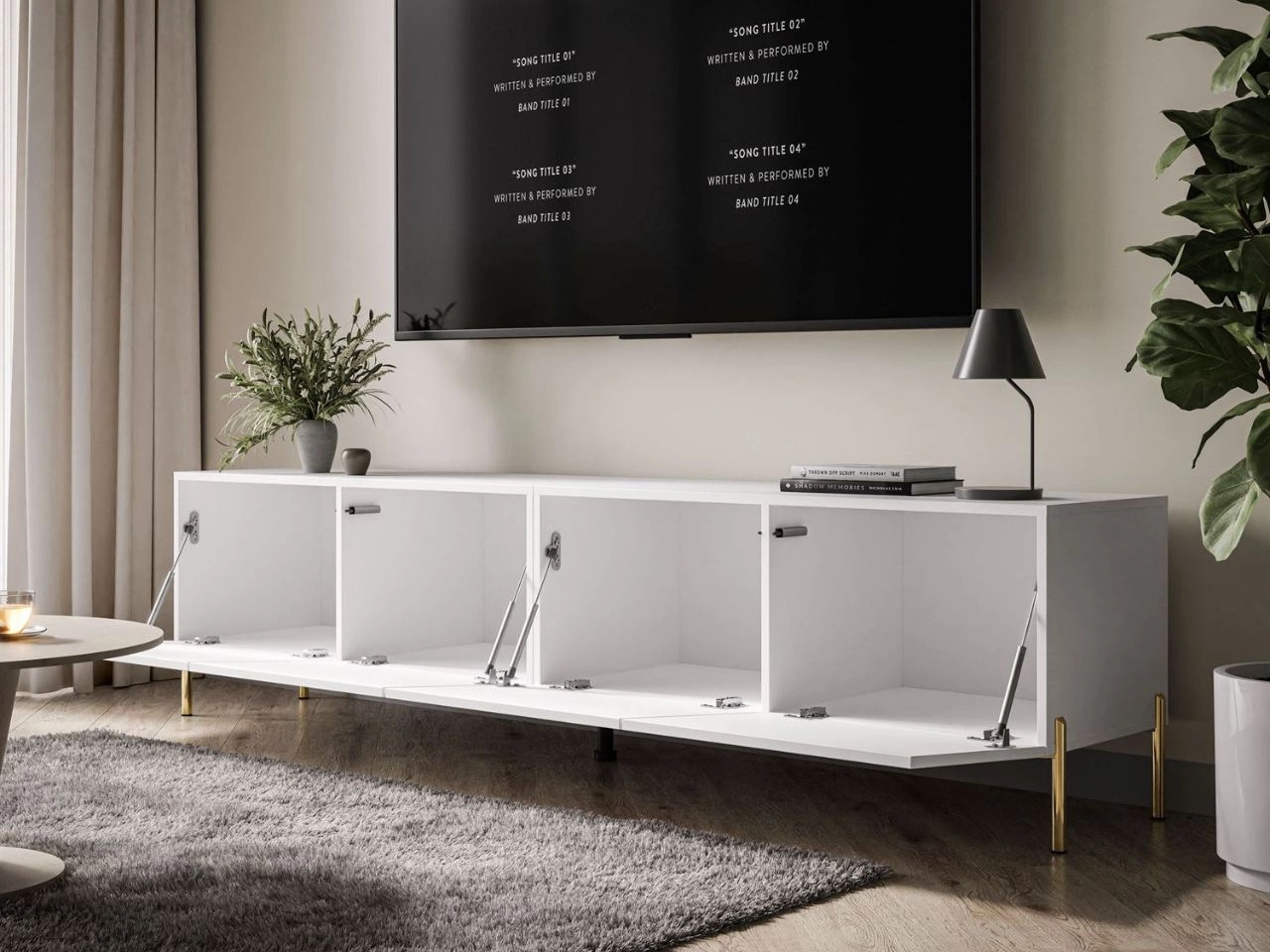 Szafka RTV pod telewizor z drzwiczkami na złotych nóżkach 200 cm Nodoo Biały połysk
