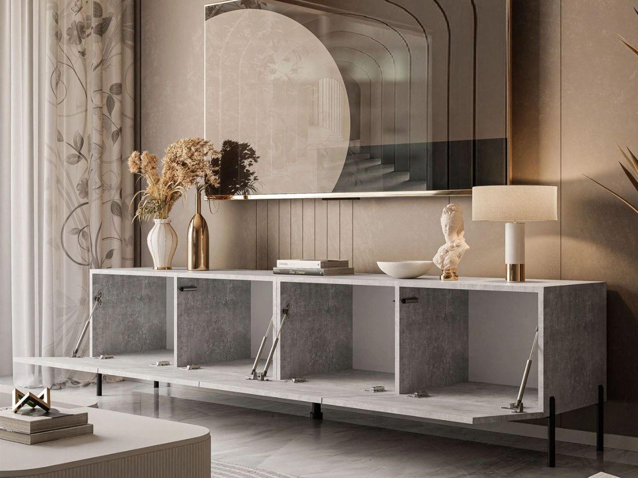 Szukasz nowoczesnej szafki RTV, która wprowadzi do wnętrza elegancję i funkcjonalność? Model Nodoo w wykończeniu betonu belatto to idealne rozwiązanie dla osób ceniących prostotę, praktyczne detale i designerski wygląd. Minimalistyczna forma i gładkie fronty sprawiają, że mebel świetnie wpasuje się w aranżacje industrialne, nowoczesne czy glamour.