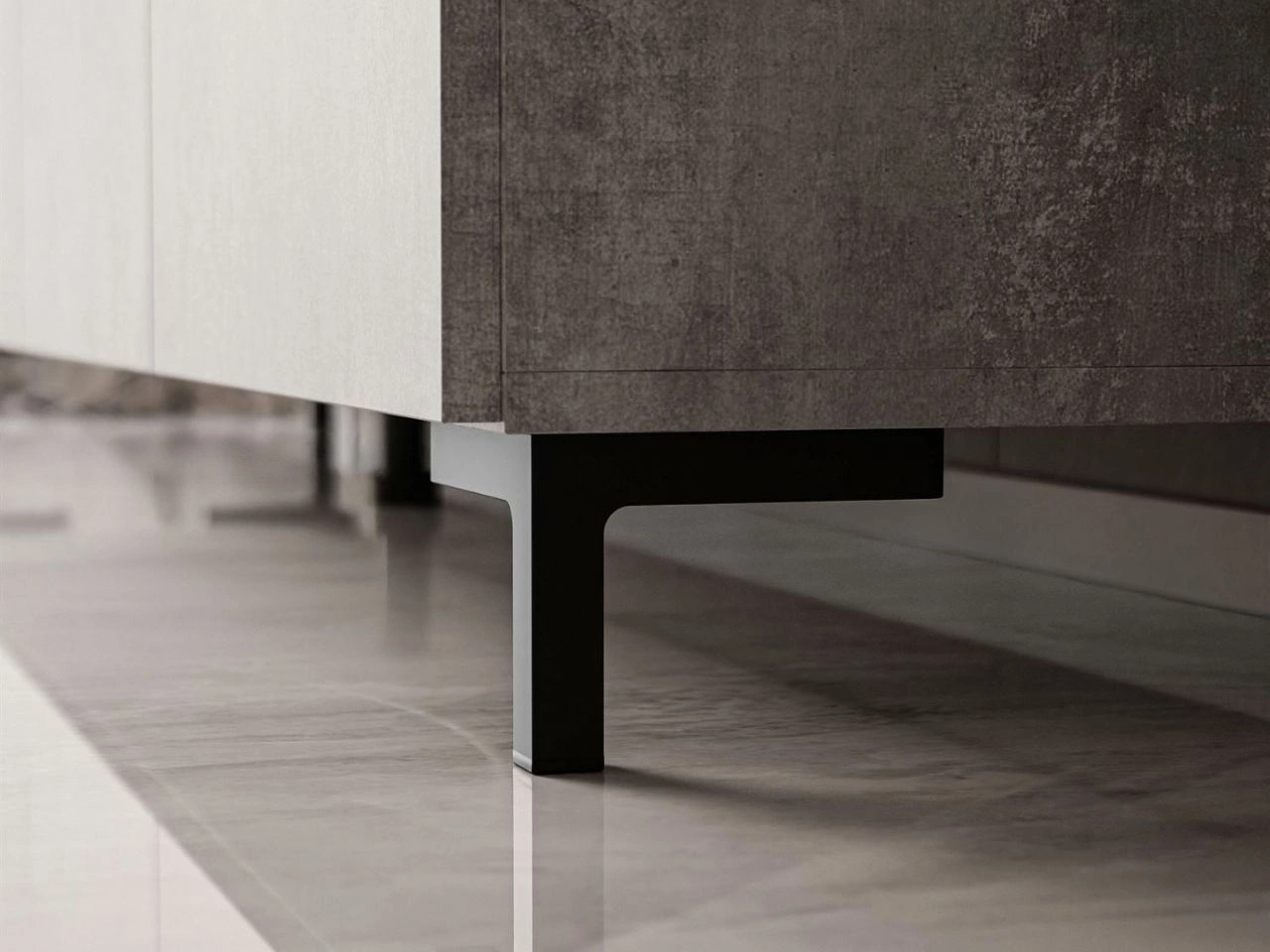 Smukłe, proste nóżki nadają konstrukcji lekkości i stabilności, a jednocześnie ułatwiają sprzątanie pod meblem. Dzięki temu szafka łączy w sobie elegancję i praktyczność, stając się efektownym uzupełnieniem nowoczesnego salonu.