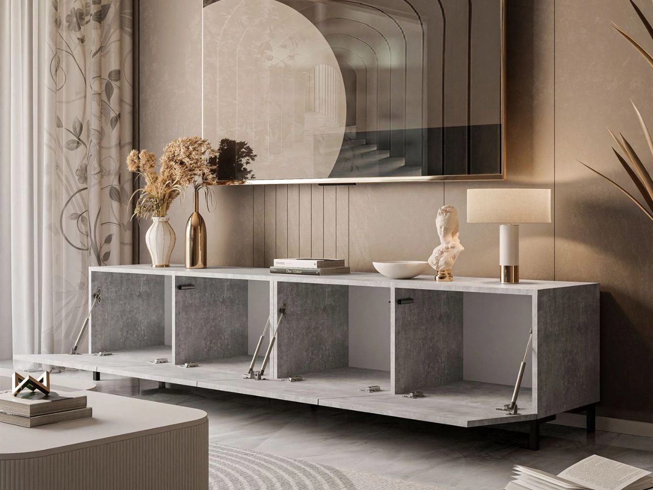 Szafka RTV pod telewizor z drzwiczkami na czarnych nóżkach 200 cm Nodoo Beton