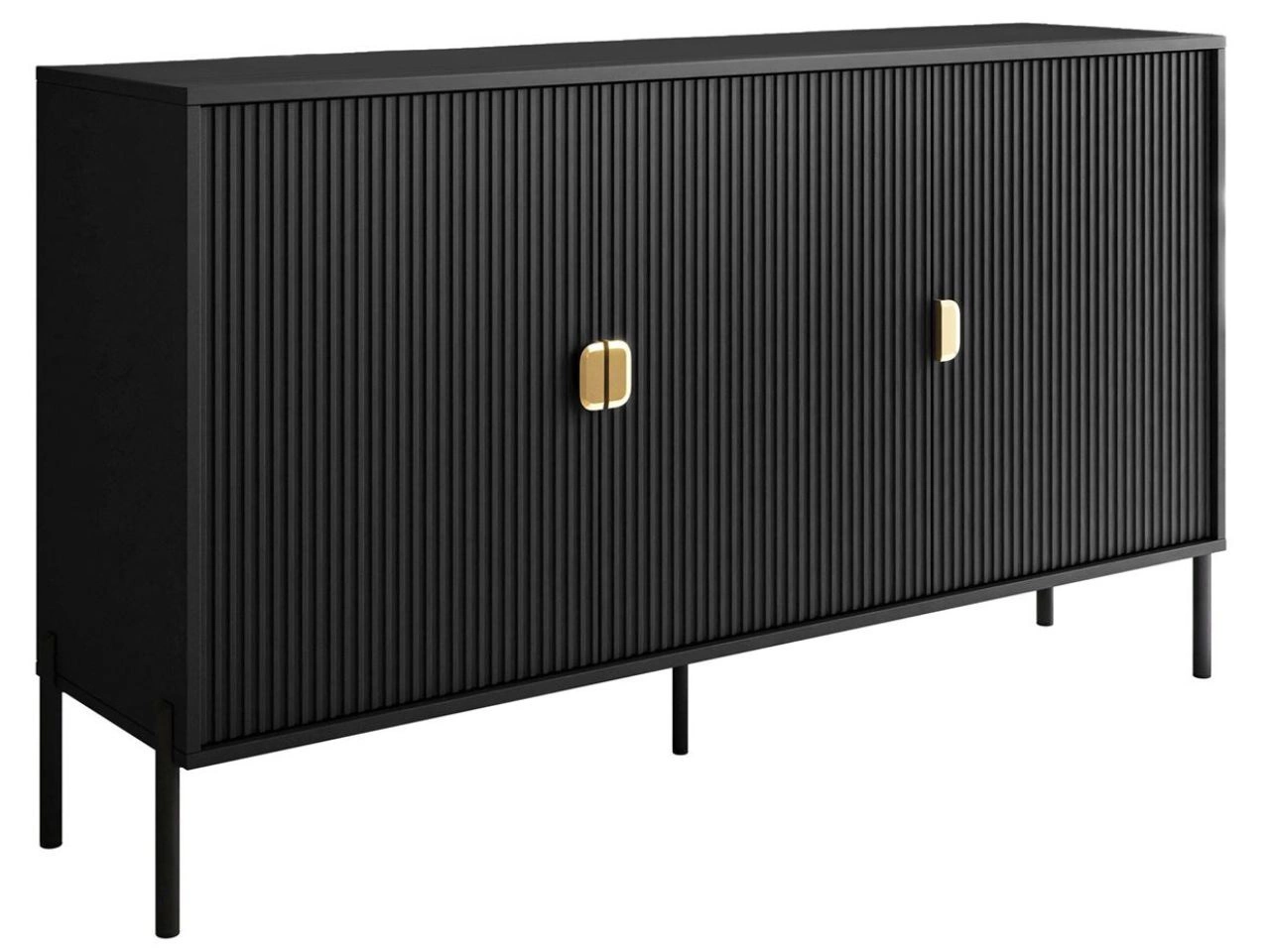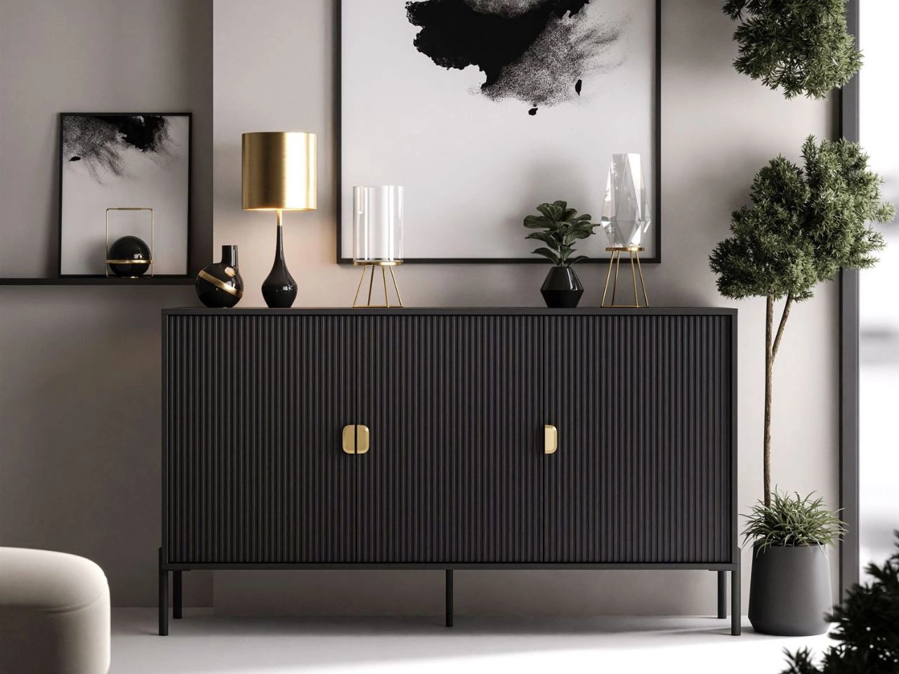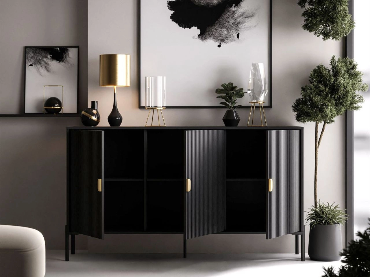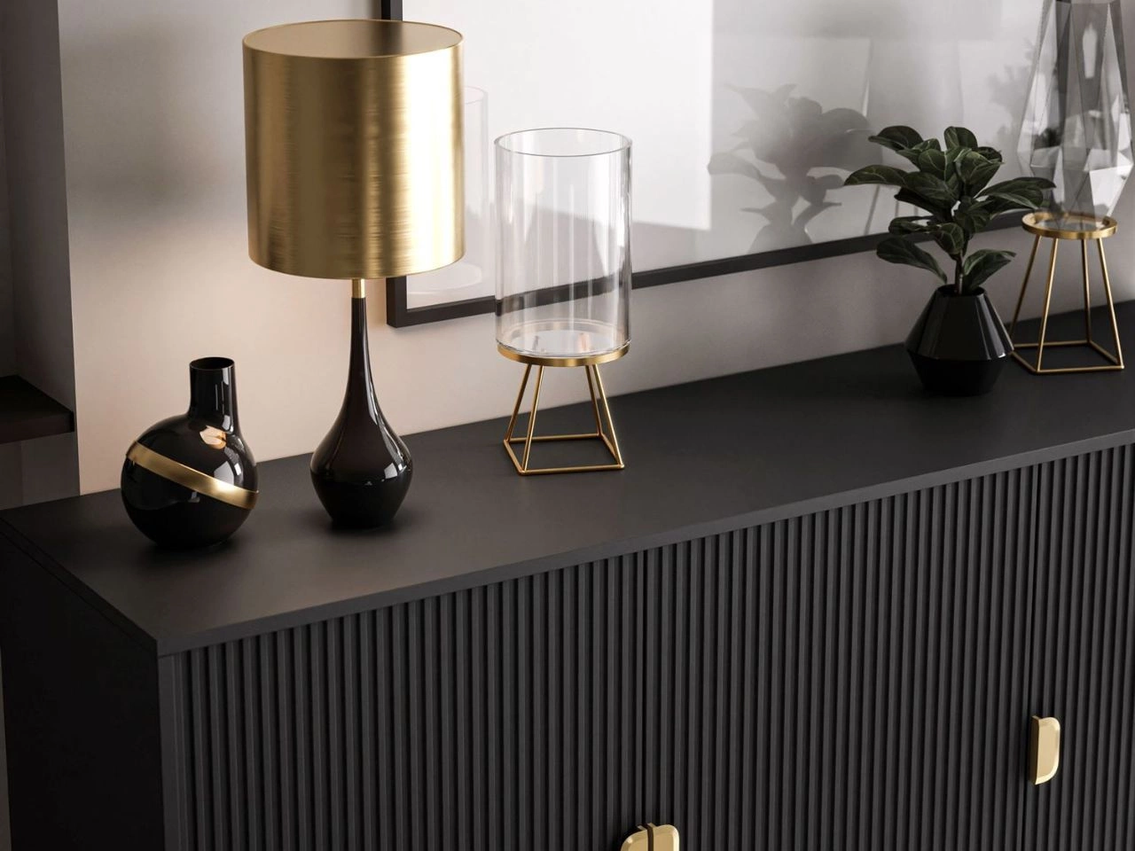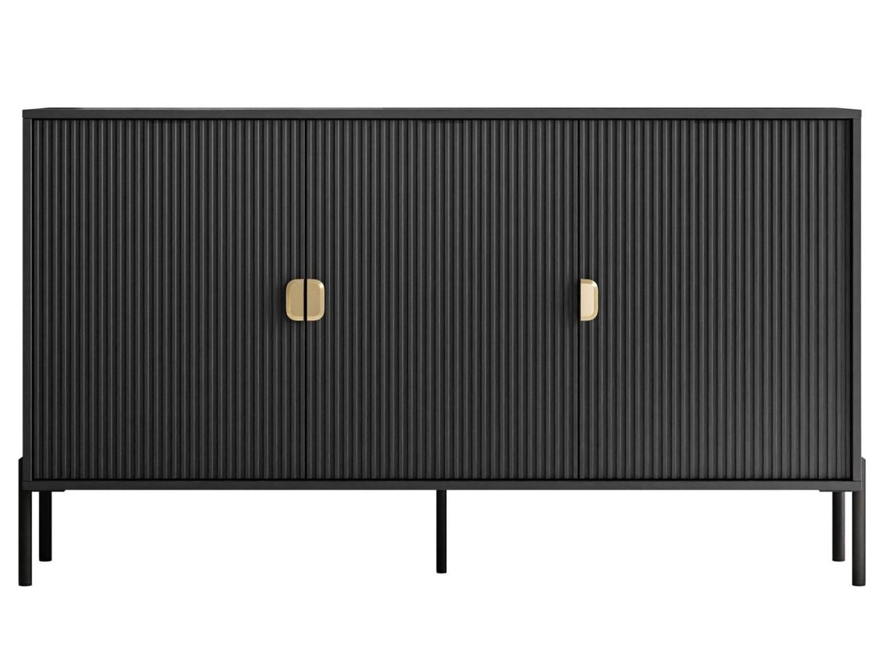 Trzydrzwiowa czarna komoda Orlean to mebel, obok którego trudno przyjść obojętnie. Starannie zaprojektowany i dopracowany w każdym detalu. Wzrok przyciągają tu przede wszystkim złote metalowe uchwyty, które umieszczono na ryflowanych frontach. Uwagę zwracają również smukłe i wysokie metalowe nóżki, które nadają meblowi lekkości wizualnej. Blat komody Orlean jest na tyle obszerny, że bez problemu pomieści nawet bardzo duży telewizor, co jeszcze bardziej podnosi poziom ergonomii prezentowanego modelu.