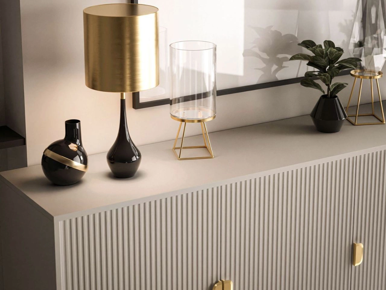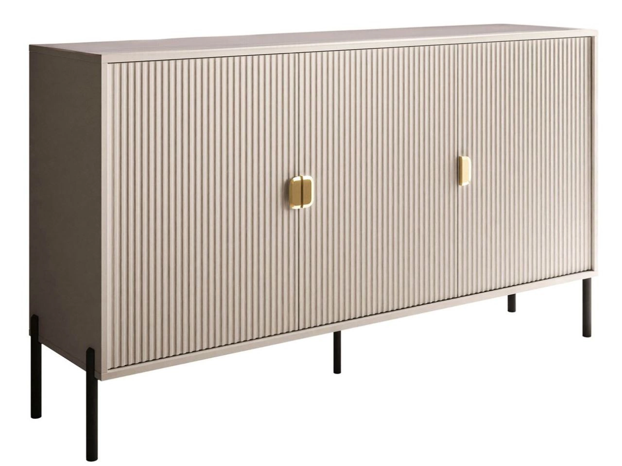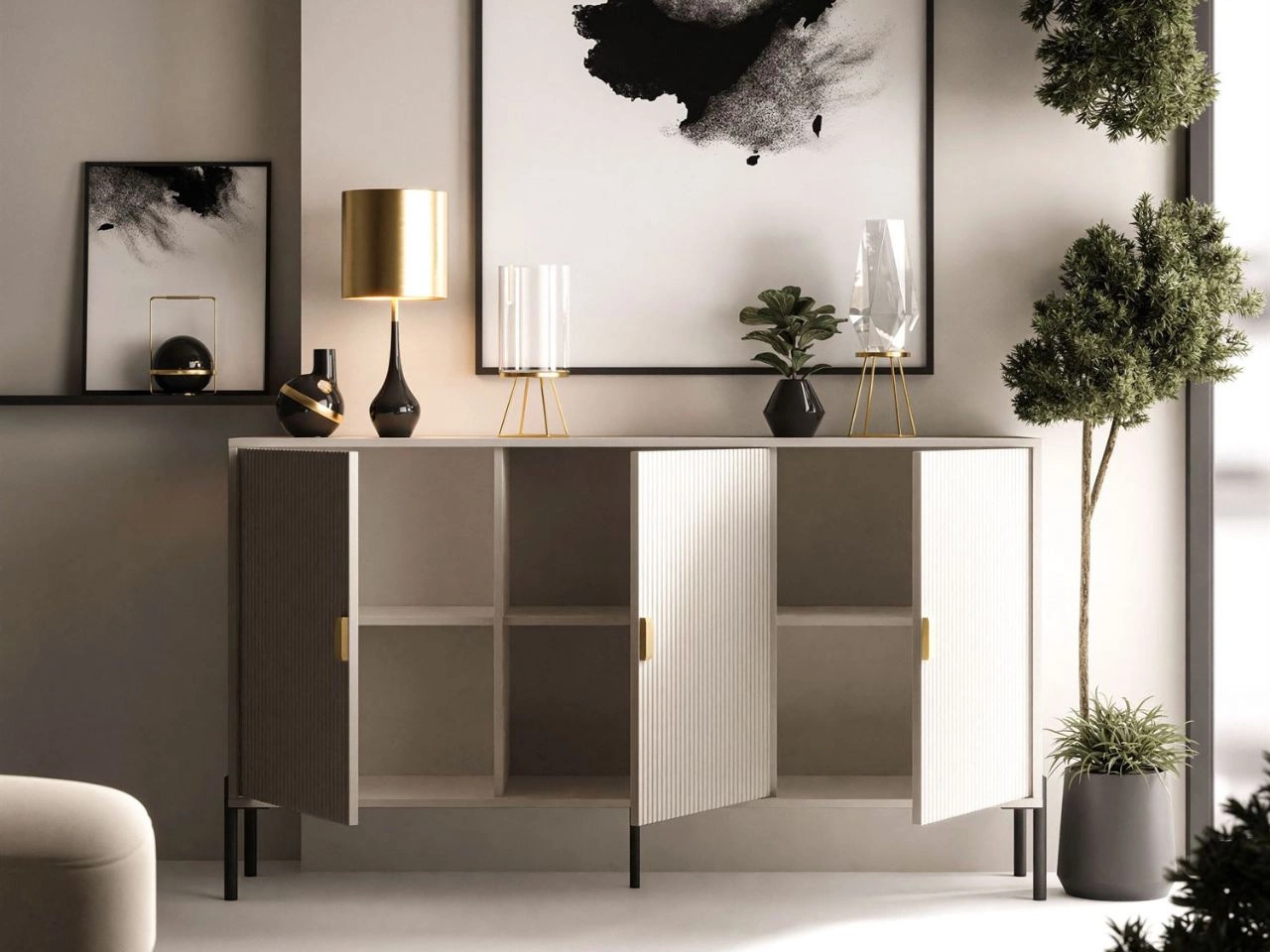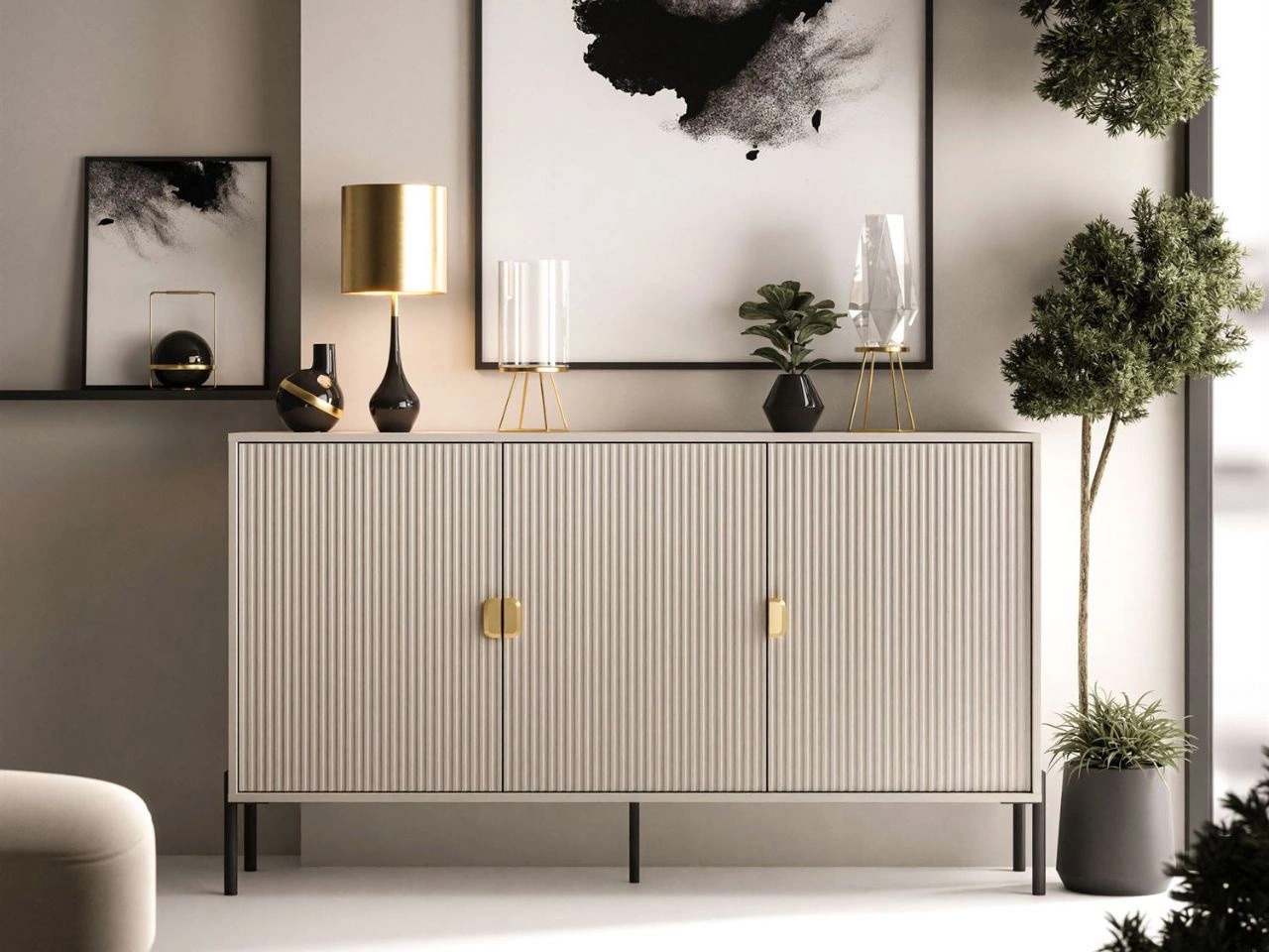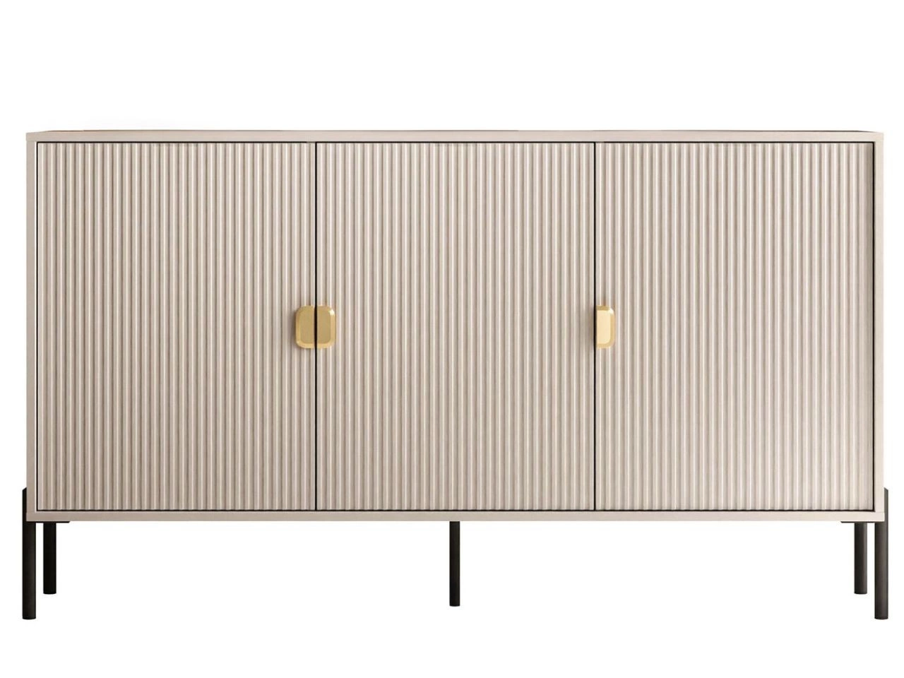 Trzydrzwiowa kaszmirowa komoda Orlean to mebel, obok którego trudno przyjść obojętnie. Starannie zaprojektowany i dopracowany w każdym detalu. Wzrok przyciągają tu przede wszystkim złote metalowe uchwyty, które umieszczono na ryflowanych frontach. Uwagę zwracają również smukłe i wysokie metalowe nóżki, które nadają meblowi lekkości wizualnej. Blat komody Orlean jest na tyle obszerny, że bez problemu pomieści nawet bardzo duży telewizor, co jeszcze bardziej podnosi poziom ergonomii prezentowanego modelu.