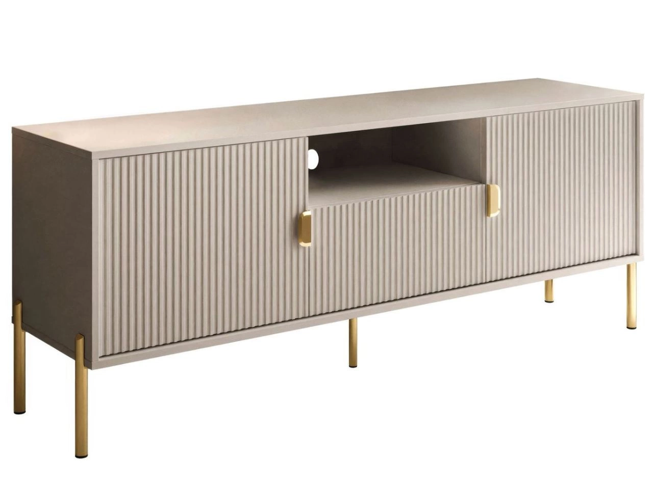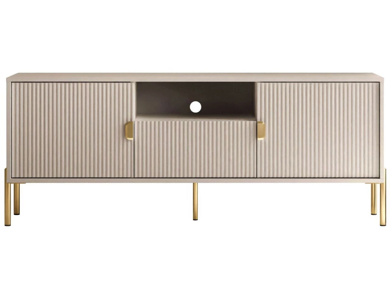 Szafka pod telewizor Orlean zbudowana została z wysokiej klasy płyty laminowanej o matowym wykończeniu. Fronty ozdobione zostały stylowym ryflowaniem ze złotymi akcentami pod postacią dyskretnych metalowych uchwytów. Mebel zaopatrzony został w dwie szafki i szufladę - wszystkie te elementy wyposażono w system cichego domyku, co pozwala na uniknięcie zbędnego trzaskania. Powyżej szuflady znajduje się wnęka na sprzęt RTV. W tylnej ściance wnęki wycięto okrągły utwór pozwalający na estetyczne wyprowadzenie przewodów na zewnątrz.