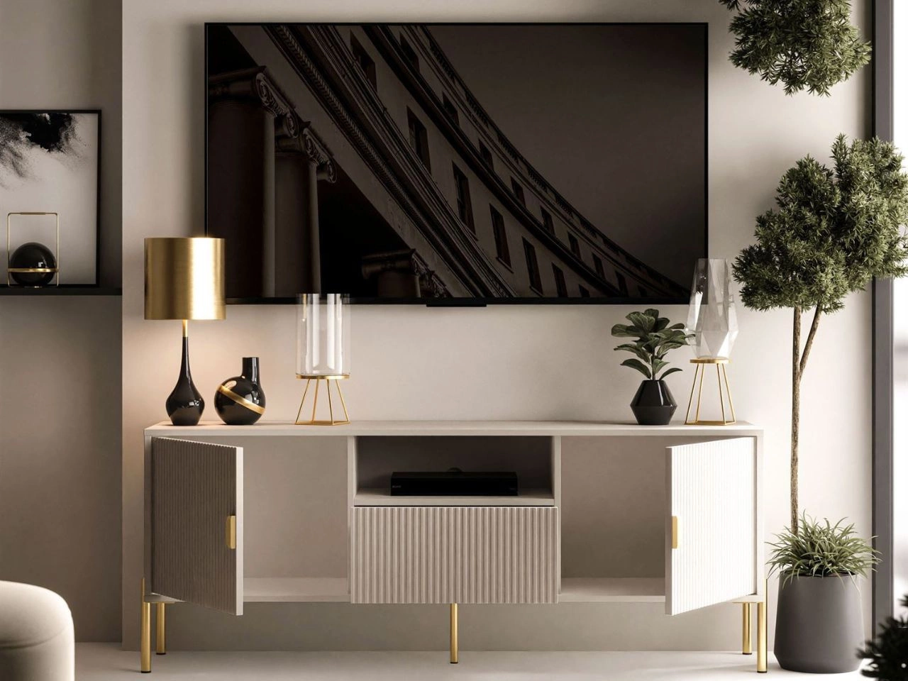 Dobierasz do: Szafka RTV dwudrzwiowa na złotych nogach z szufladą Orlean kaszmir mat