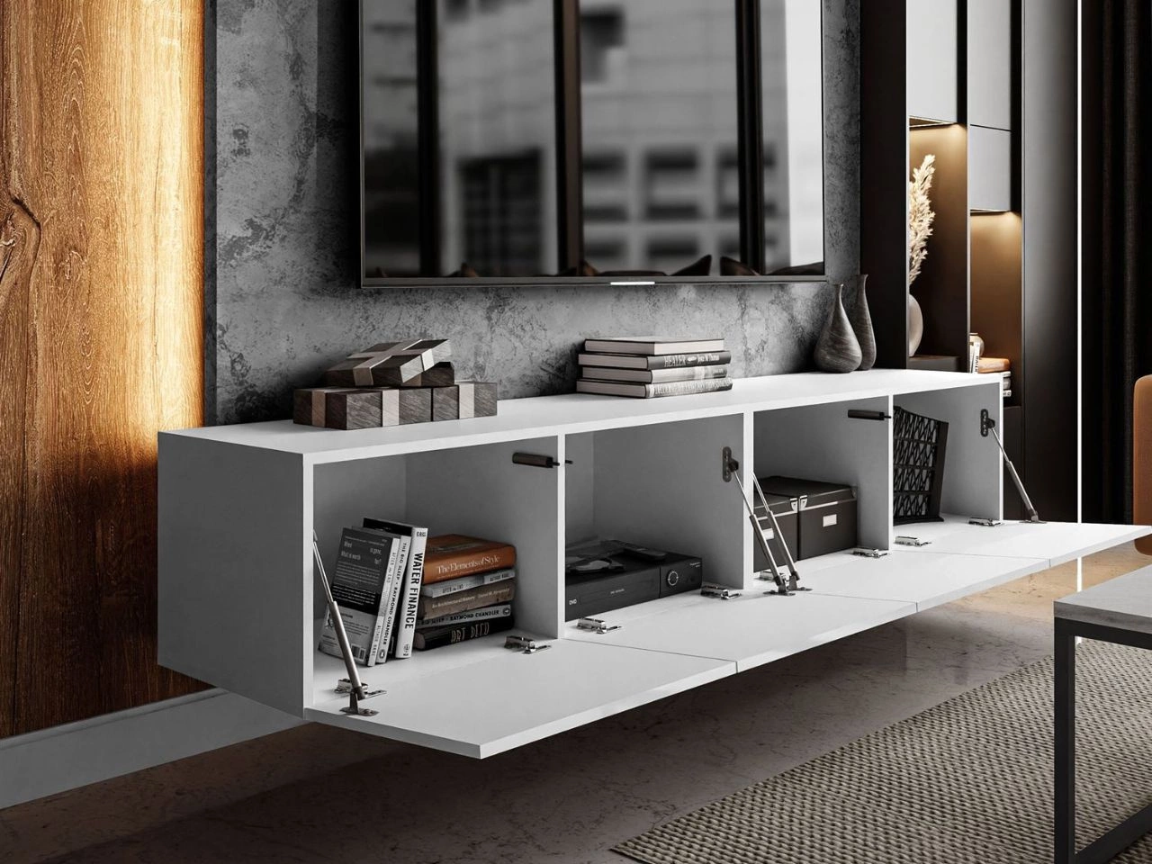 Wisząca szafka RTV pod telewizor z drzwiczkami i oświetlewniem LED 200 cm Nodoo Biały połysk