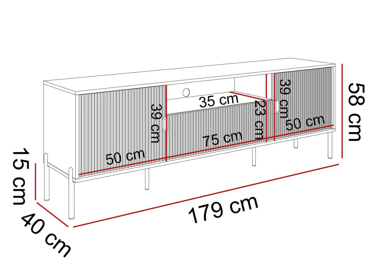 Szafka pod telewizor Orlean zbudowana została z wysokiej klasy płyty laminowanej o matowym wykończeniu. Fronty ozdobione zostały stylowym ryflowaniem ze złotymi akcentami pod postacią dyskretnych metalowych uchwytów. Mebel zaopatrzony został w dwie szafki i szufladę - wszystkie te elementy wyposażono w system cichego domyku, co pozwala na uniknięcie zbędnego trzaskania. Powyżej szuflady znajduje się wnęka na sprzęt RTV. W tylnej ściance wnęki wycięto okrągły utwór pozwalający na estetyczne wyprowadzenie przewodów na zewnątrz.