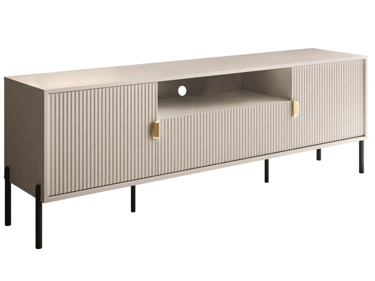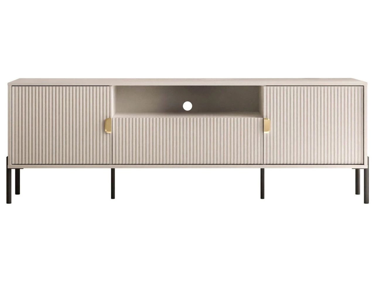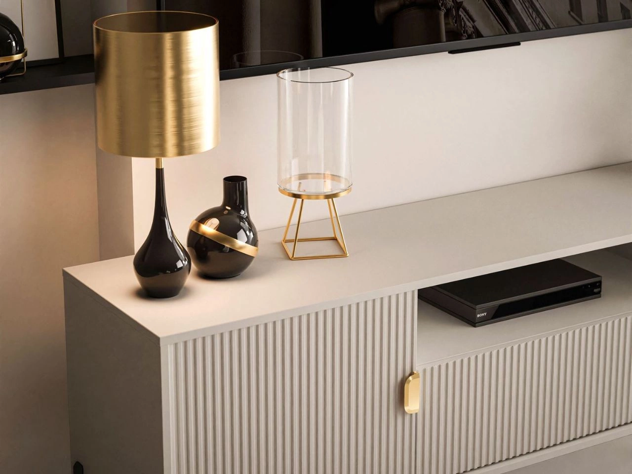 Szafka pod telewizor Orlean zbudowana została z wysokiej klasy płyty laminowanej o matowym wykończeniu. Fronty ozdobione zostały stylowym ryflowaniem ze złotymi akcentami pod postacią dyskretnych metalowych uchwytów. Mebel zaopatrzony został w dwie szafki i szufladę - wszystkie te elementy wyposażono w system cichego domyku, co pozwala na uniknięcie zbędnego trzaskania. Powyżej szuflady znajduje się wnęka na sprzęt RTV. W tylnej ściance wnęki wycięto okrągły utwór pozwalający na estetyczne wyprowadzenie przewodów na zewnątrz.