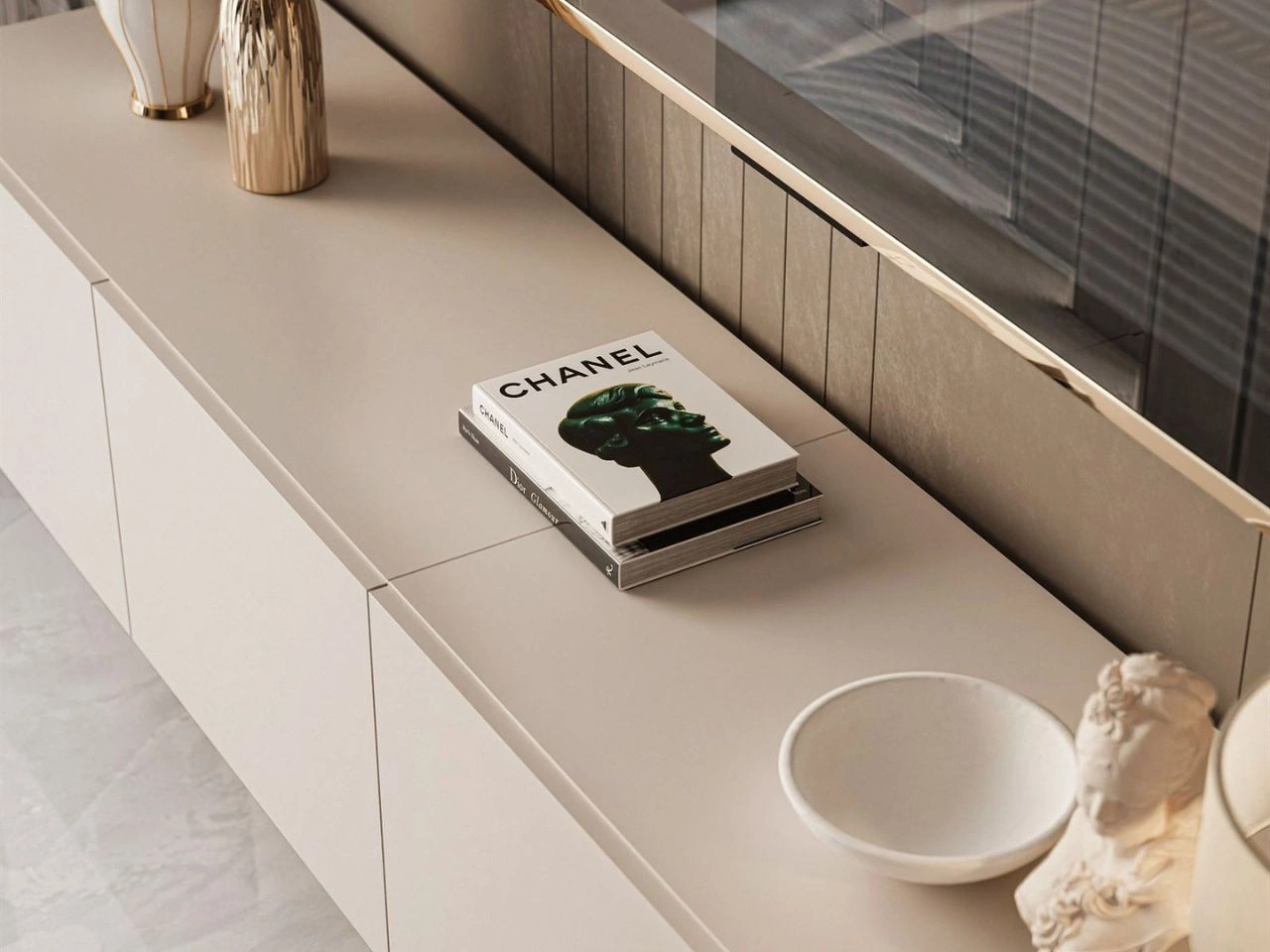 Korpus mebla wykonany z wytrzymałej płyty laminowanej zapewnia trwałość, a eleganckie wykończenie nadaje całości nowoczesnego charakteru. Fronty zostały wykończone obrzeżem ABS, które zwiększa ich odporność na uszkodzenia i podkreśla estetykę mebla. Dzięki zastosowaniu siłowników oraz systemu push to open, otwierają się lekko i płynnie – zarówno do góry, jak i w dół – zachowując nowoczesny, jednolity wygląd. Szeroki blat szafki to doskonałe miejsce na sprzęt RTV, dekoracje czy oświetlenie.