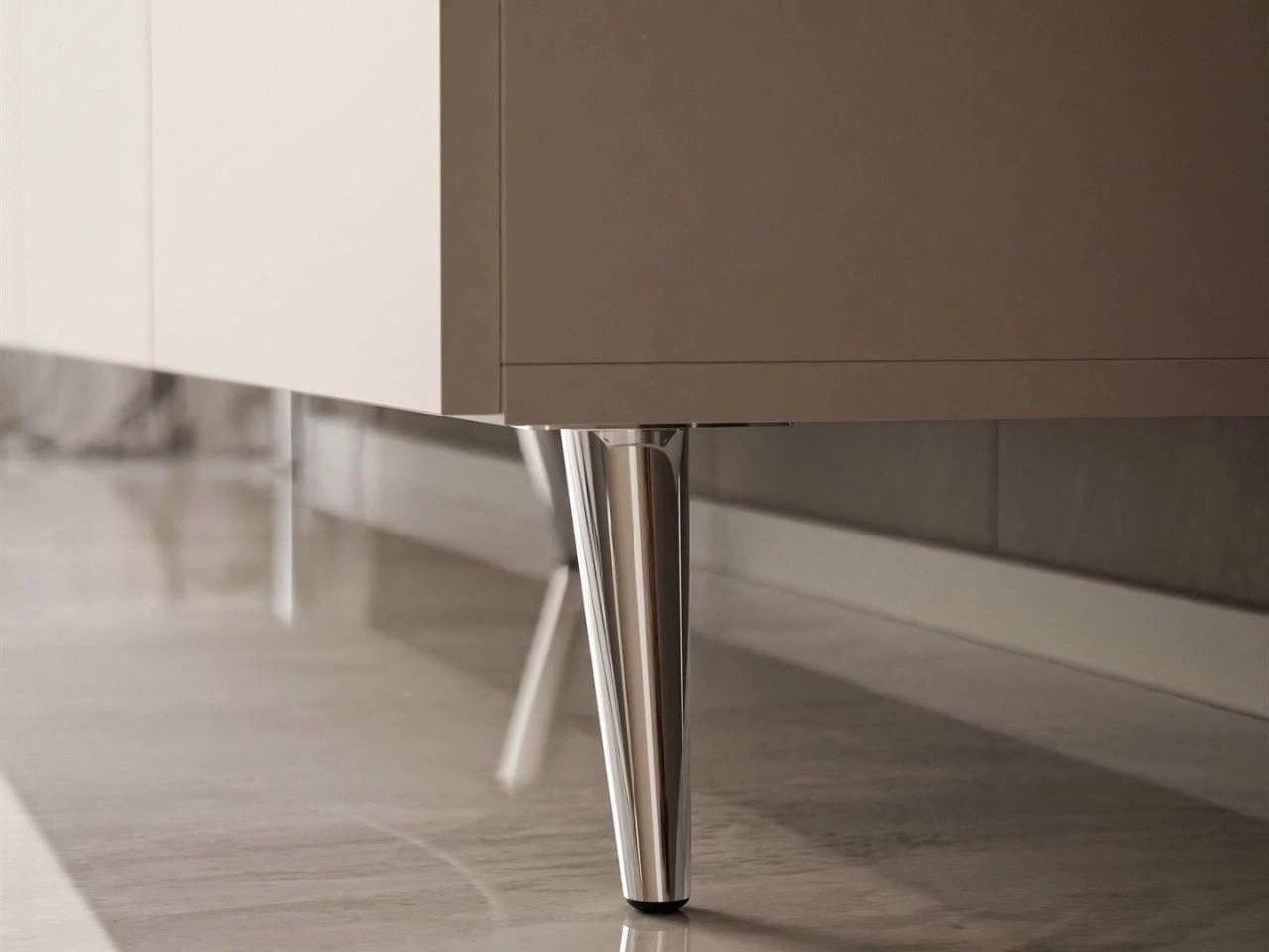 Smukłe, skośne metalowe nóżki nadają konstrukcji lekkości i stabilności, a jednocześnie ułatwiają sprzątanie pod meblem. Dzięki temu szafka łączy w sobie elegancję i praktyczność, stając się efektownym uzupełnieniem nowoczesnego salonu.