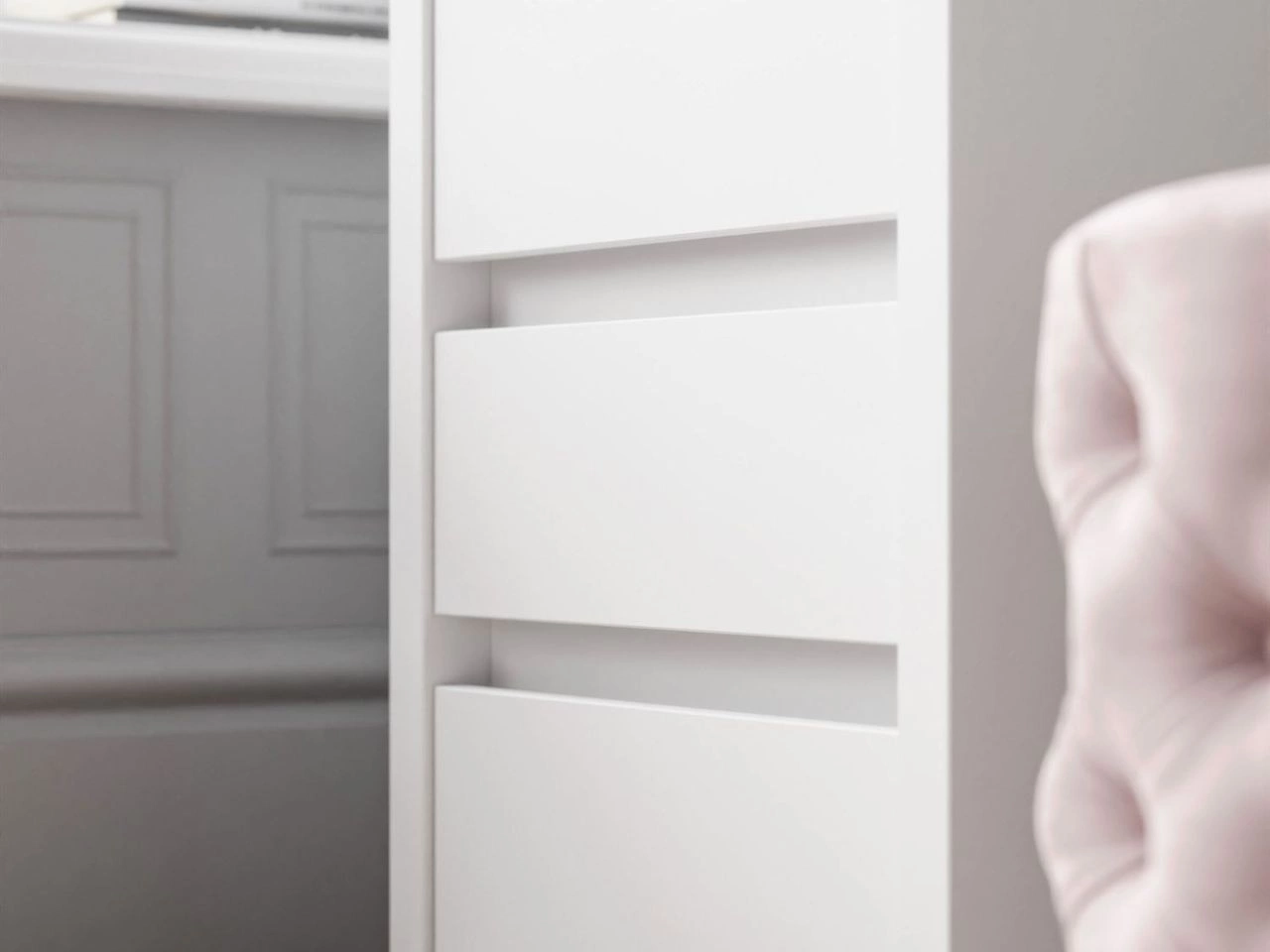 Toaletka Nesso to bardzo przemyślany model, który oferuje ciekawe rozwiązania konstrukcyjne, opakowane w świetny design. Mebel wykonany jest z wysokiej klasy płyty laminowanej, której obrzeża zabezpieczono okleiną ABS. Zabieg ten ma na celu ochronę przed powstawaniem zarysowań i drobnych uszkodzeń mechanicznych. Pod blatem znajdują się cztery szuflady, które można zamontować zarówno po lewej, jak i prawej stronie. Szuflady poruszają się na prowadnicach kulkowych, oferując tym samym pełny wysuw.