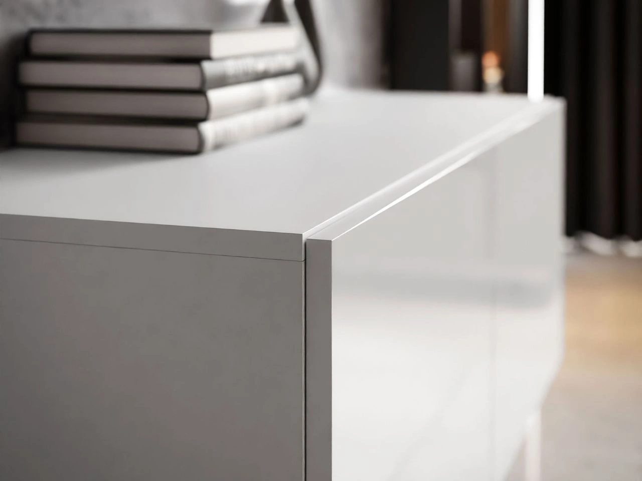 Korpus mebla wykonany z wytrzymałej płyty laminowanej zapewnia trwałość, a eleganckie wykończenie nadaje całości nowoczesnego charakteru. Fronty zostały wykończone obrzeżem ABS oraz akrylem, które zwiększają ich odporność na uszkodzenia i podkreśla estetykę mebla. Dzięki zastosowaniu siłowników oraz systemu push to open, otwierają się lekko i płynnie – zarówno do góry, jak i w dół – zachowując nowoczesny, jednolity wygląd. Szeroki blat szafki to doskonałe miejsce na sprzęt RTV, dekoracje czy oświetlenie.