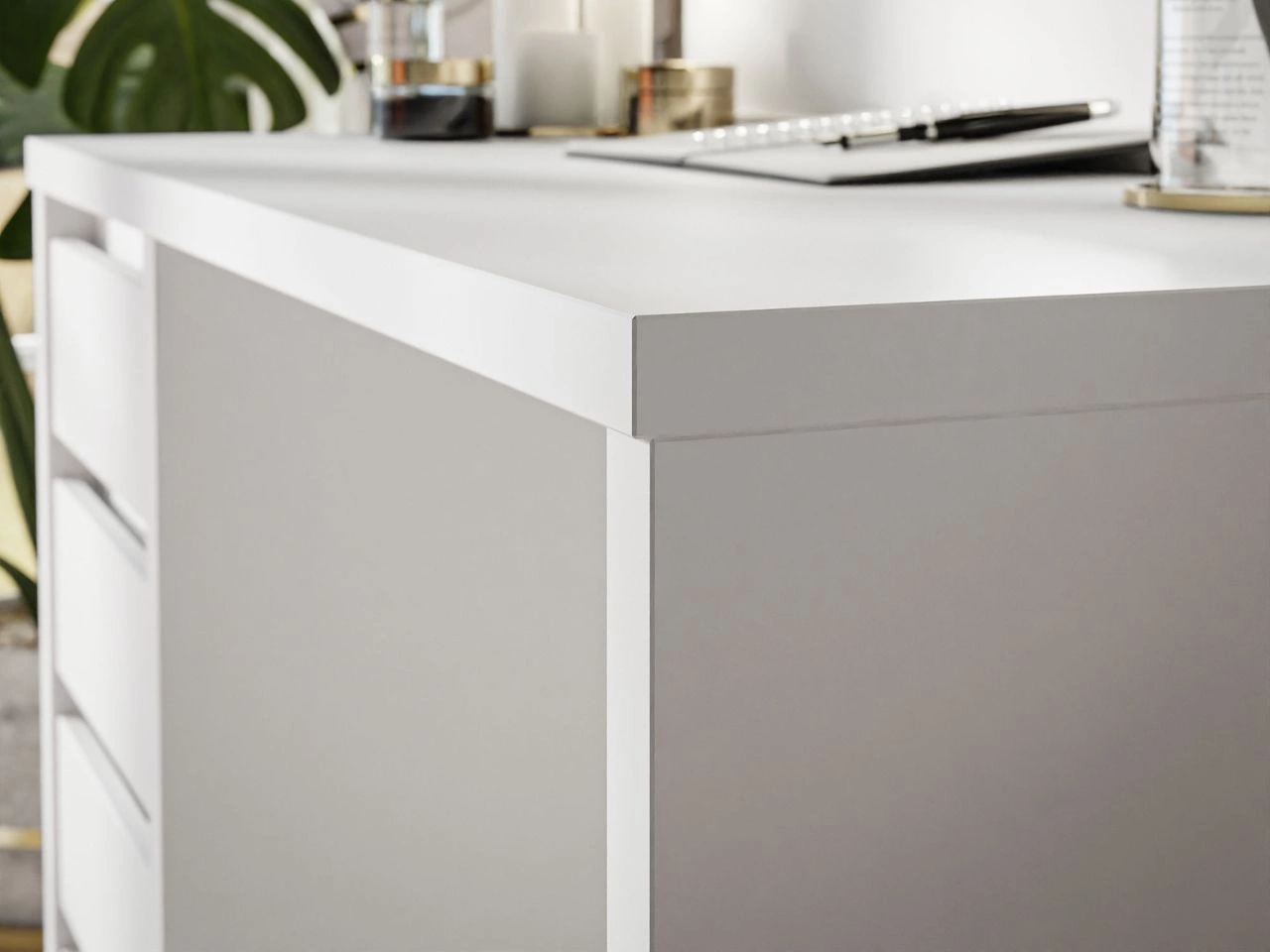 Toaletka Nesso to bardzo przemyślany model, który oferuje ciekawe rozwiązania konstrukcyjne, opakowane w świetny design. Mebel wykonany jest z wysokiej klasy płyty laminowanej, której obrzeża zabezpieczono okleiną ABS. Zabieg ten ma na celu ochronę przed powstawaniem zarysowań i drobnych uszkodzeń mechanicznych. Pod blatem znajdują się cztery szuflady, które można zamontować zarówno po lewej, jak i prawej stronie. Szuflady poruszają się na prowadnicach kulkowych, oferując tym samym pełny wysuw.