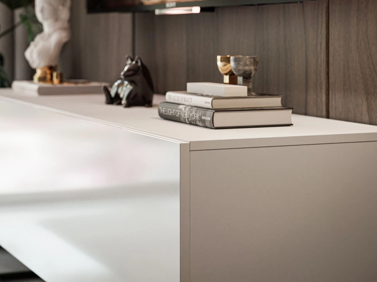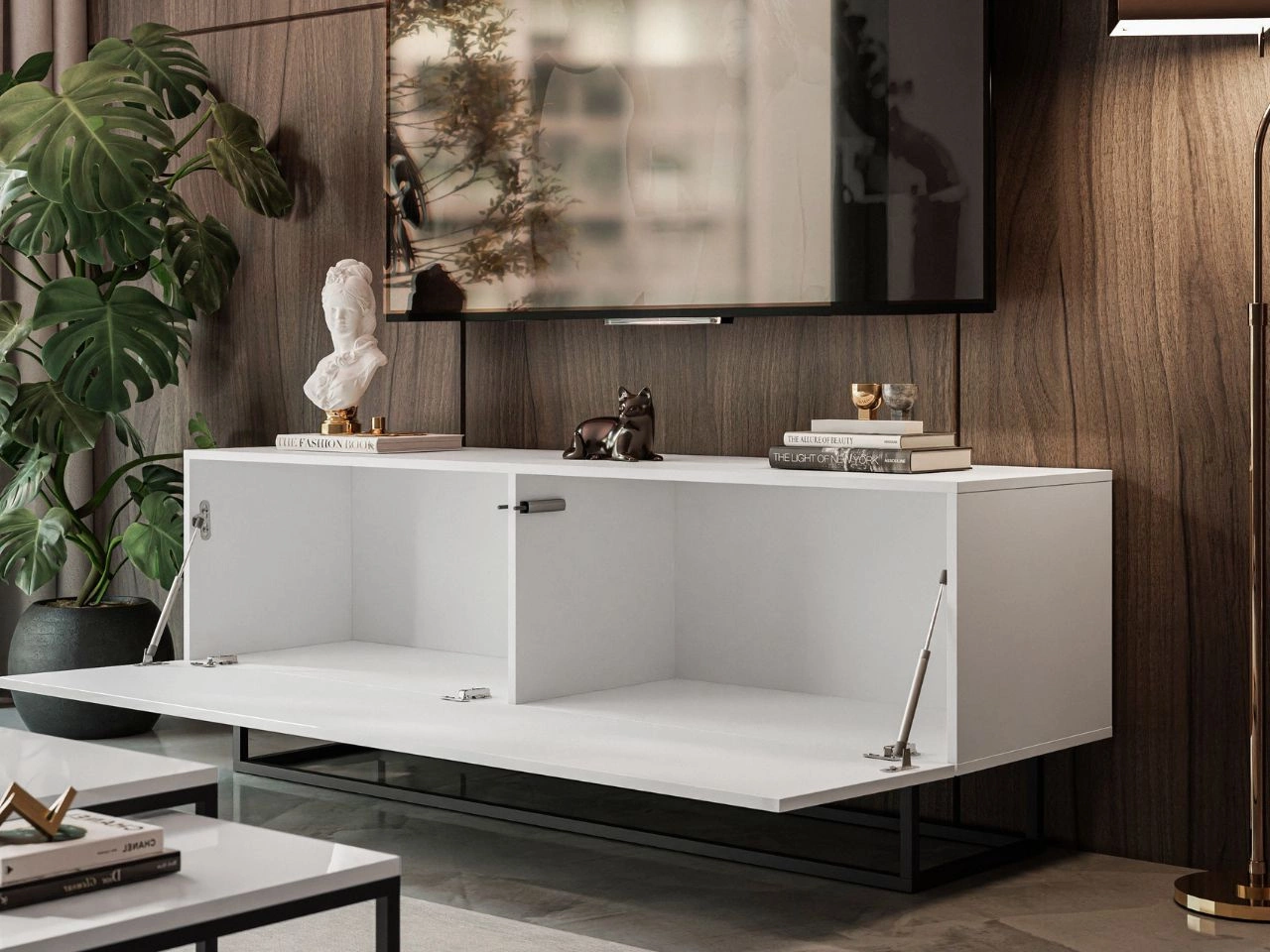 Korpus mebla wykonany z wytrzymałej płyty laminowanej zapewnia trwałość, a eleganckie wykończenie nadaje całości nowoczesnego charakteru. Fronty zostały wykończone obrzeżem ABS oraz akrylem, które zwiększają ich odporność na uszkodzenia i podkreśla estetykę mebla. Dzięki zastosowaniu siłowników oraz systemu push to open, otwierają się lekko i płynnie – zarówno do góry, jak i w dół – zachowując nowoczesny, jednolity wygląd. Szeroki blat szafki to doskonałe miejsce na sprzęt RTV, dekoracje czy oświetlenie.