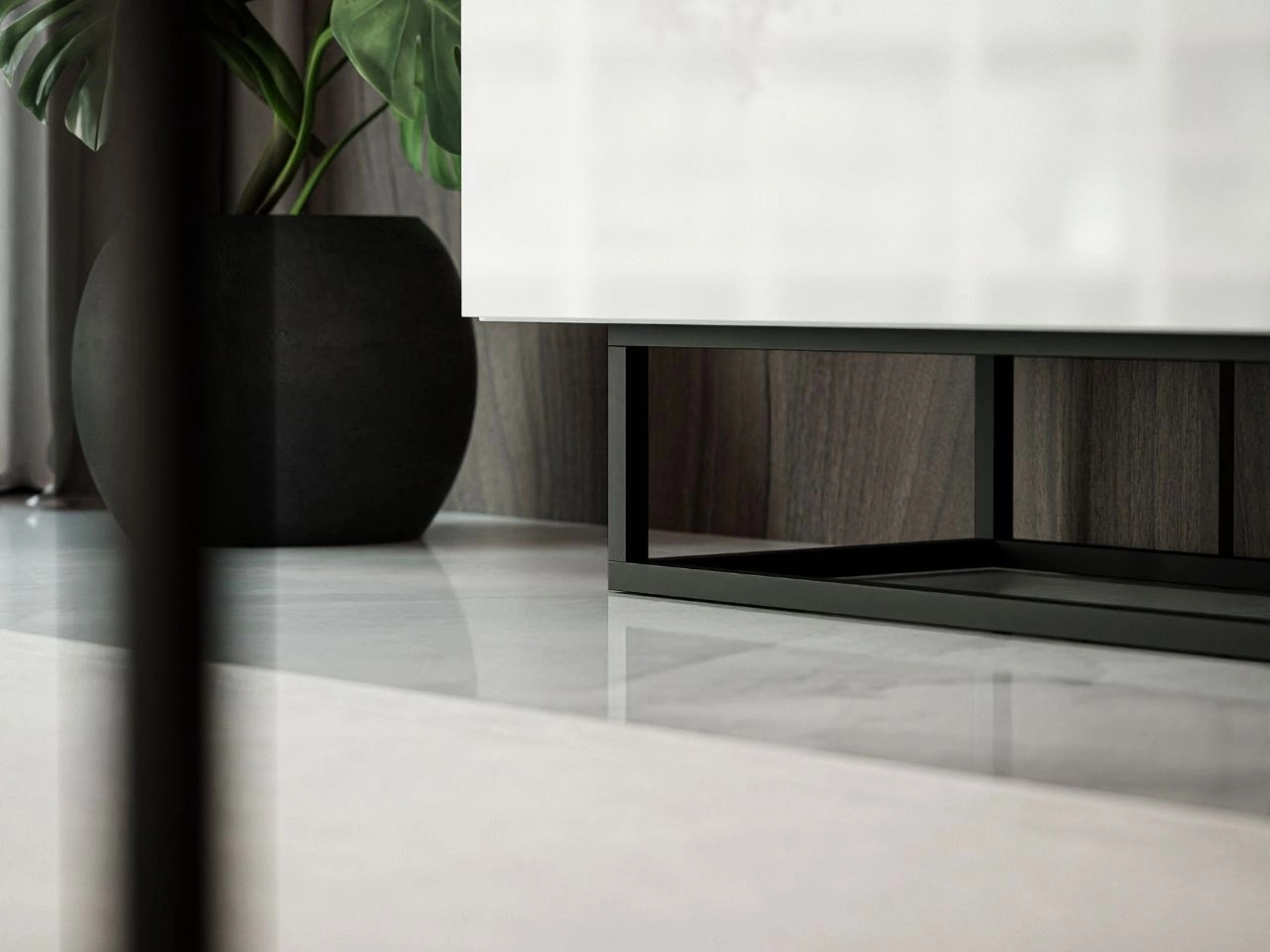 Szafka RTV pod telewizor z drzwiczkami na czarnym stelażu 150 cm Nodoo Biały połysk