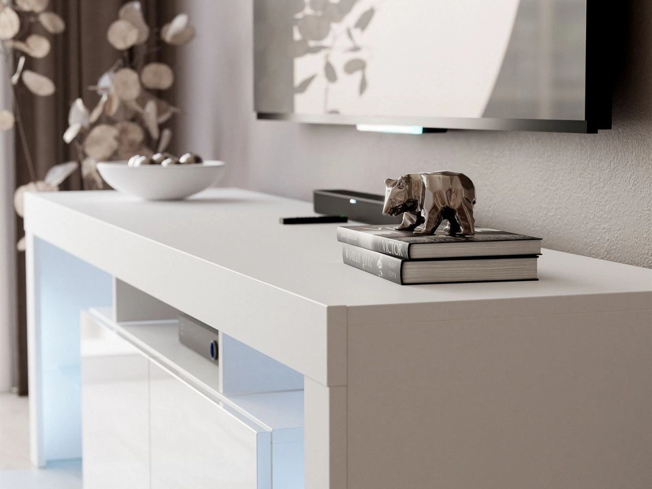 Fronty wykonane z płyty pokrytej akrylem w technologii wysokiego połysku są odporne na zarysowania i pięknie odbijają światło, nadając meblowi elegancji. Uchylnie otwierane schowki umożliwiają wygodne przechowywanie sprzętu elektronicznego, konsol czy płyt, a otwarte wnęki idealnie sprawdzą się do eksponowania często używanych urządzeń. Solidny korpus z wysokogatunkowej płyty laminowanej, odpornej na wilgoć i uszkodzenia, gwarantuje trwałość oraz długie użytkowanie. Gładki blat tworzy stabilną podstawę dla telewizora i stanowi przestrzeń na dekoracje oraz dodatki.