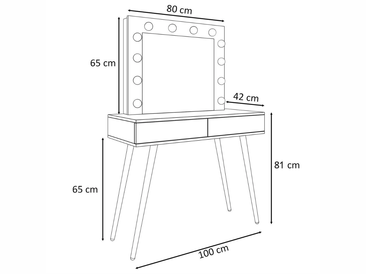 Biała toaletka Olivine z lustrem i oświetleniem LED to starannie wykończony mebel, który bez trudu dopasuje się do wielu stylów wnętrz. Korpus oraz rama lustra powstały z matowej płyty laminowanej, natomiast fronty wykończono w wysokim połysku. Konstrukcję podtrzymują czarne, metalowe nogi – efektowne wizualnie i zapewniające solidną stabilność.