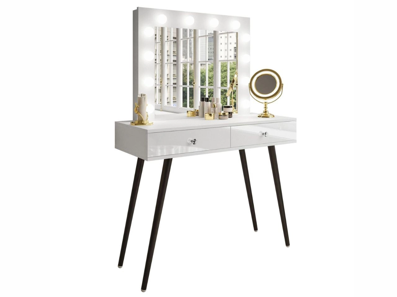 Toaletka glamour z szufladami, czarnymi nogami i oświetleniem LED Olivine biały połysk