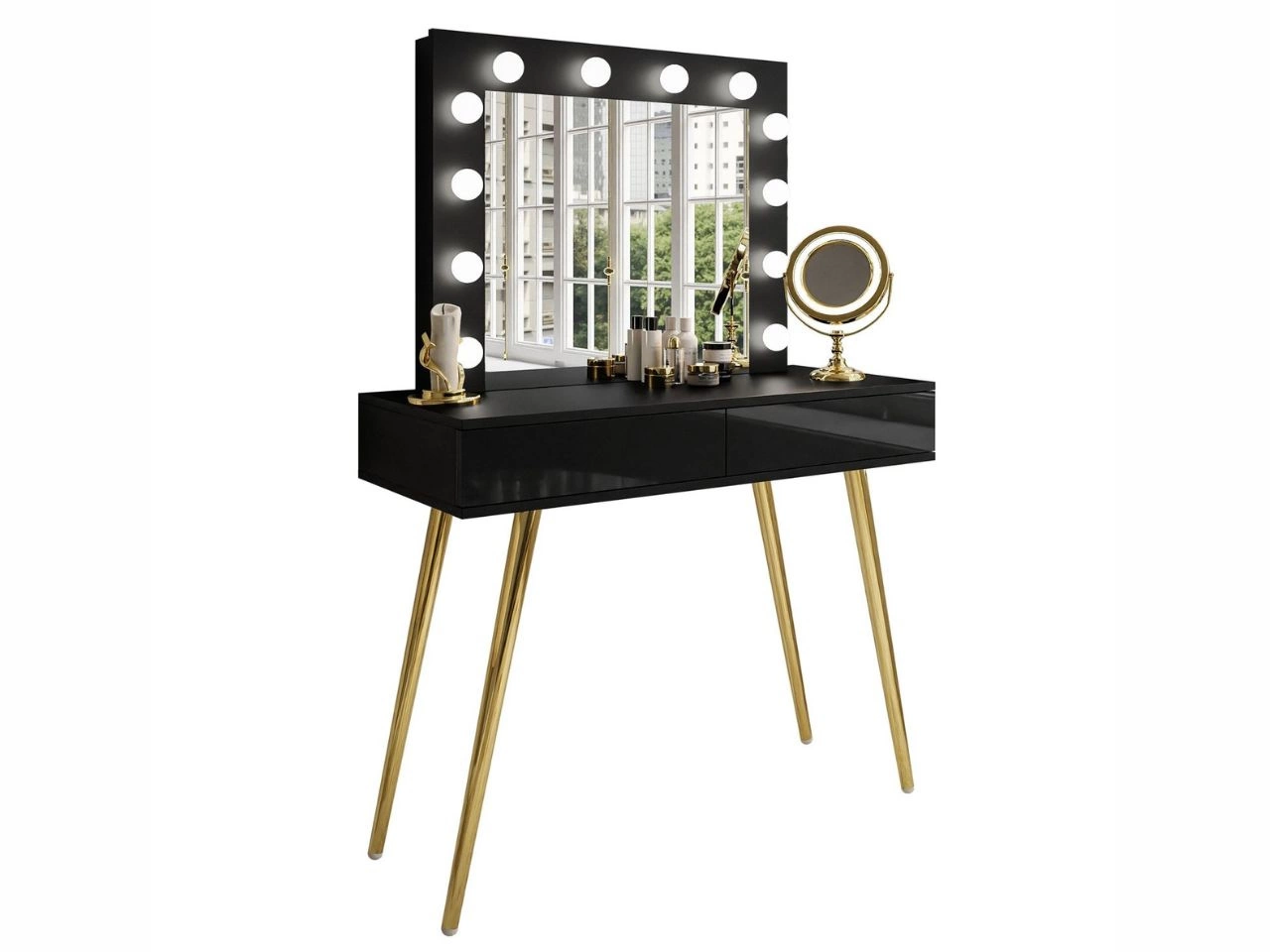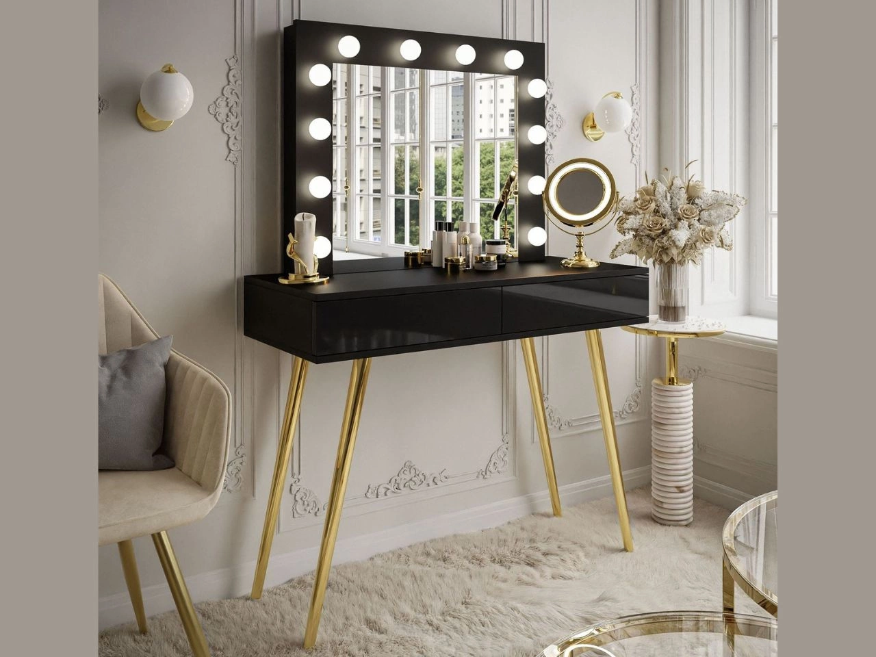Czarna toaletka Olivine z lustrem i oświetleniem LED to starannie wykończony mebel, który bez trudu dopasuje się do wielu stylów wnętrz. Korpus oraz rama lustra powstały z matowej płyty laminowanej, natomiast fronty wykończono w wysokim połysku. Konstrukcję podtrzymują złote, metalowe nogi – efektowne wizualnie i zapewniające solidną stabilność.