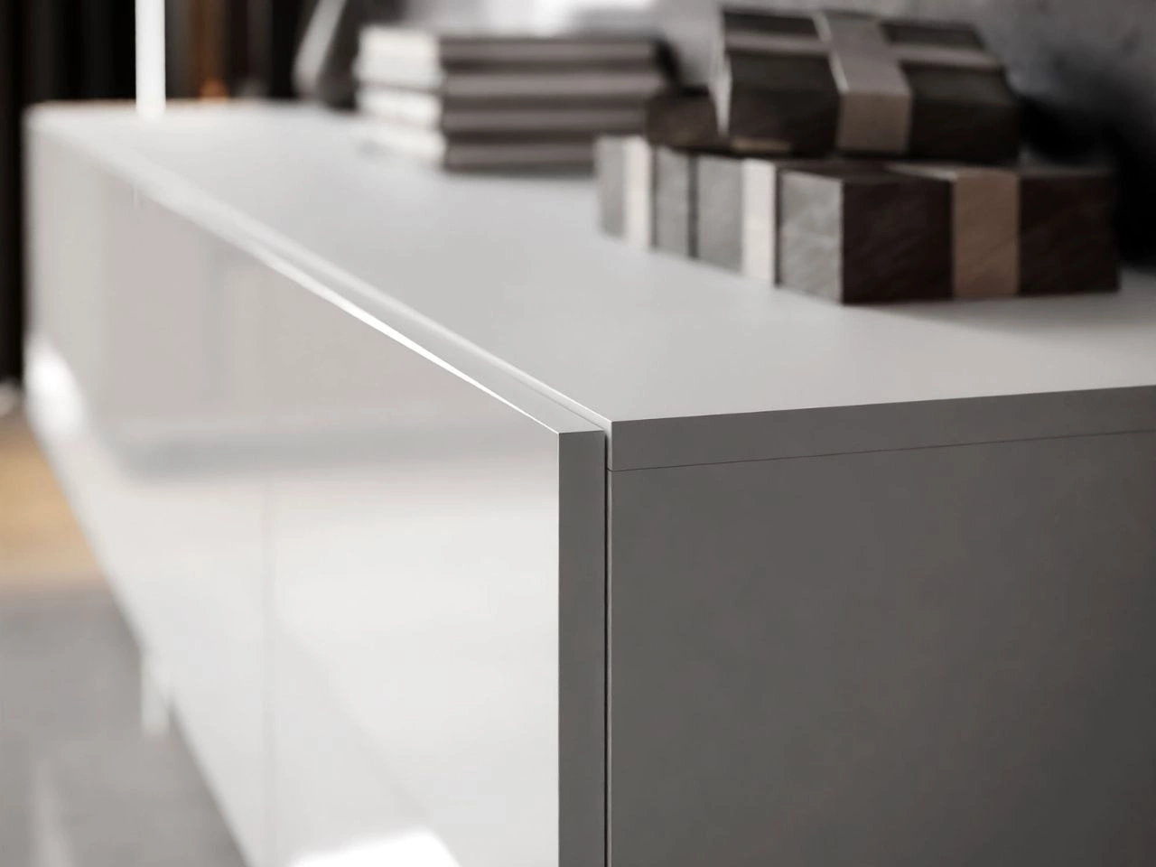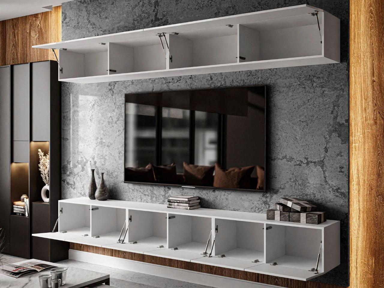 Meblościanka RTV oferuje dużo miejsca do przechowywania dzięki praktycznemu podziałowi przestrzeni – w części górnej znajdują się cztery pojemne schowki, natomiast w dolnym segmencie sześć szafek. Fronty wykończone w wysokim połysku optycznie powiększają przestrzeń i nadają całości eleganckiego charakteru. To rozwiązanie, które świetnie łączy estetykę z wygodą codziennego użytkowania.