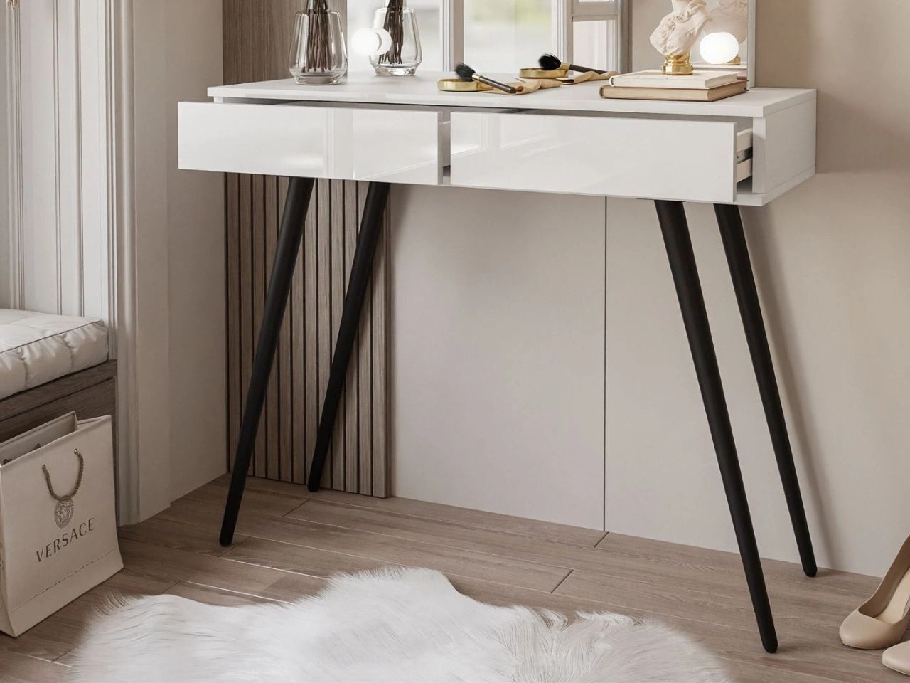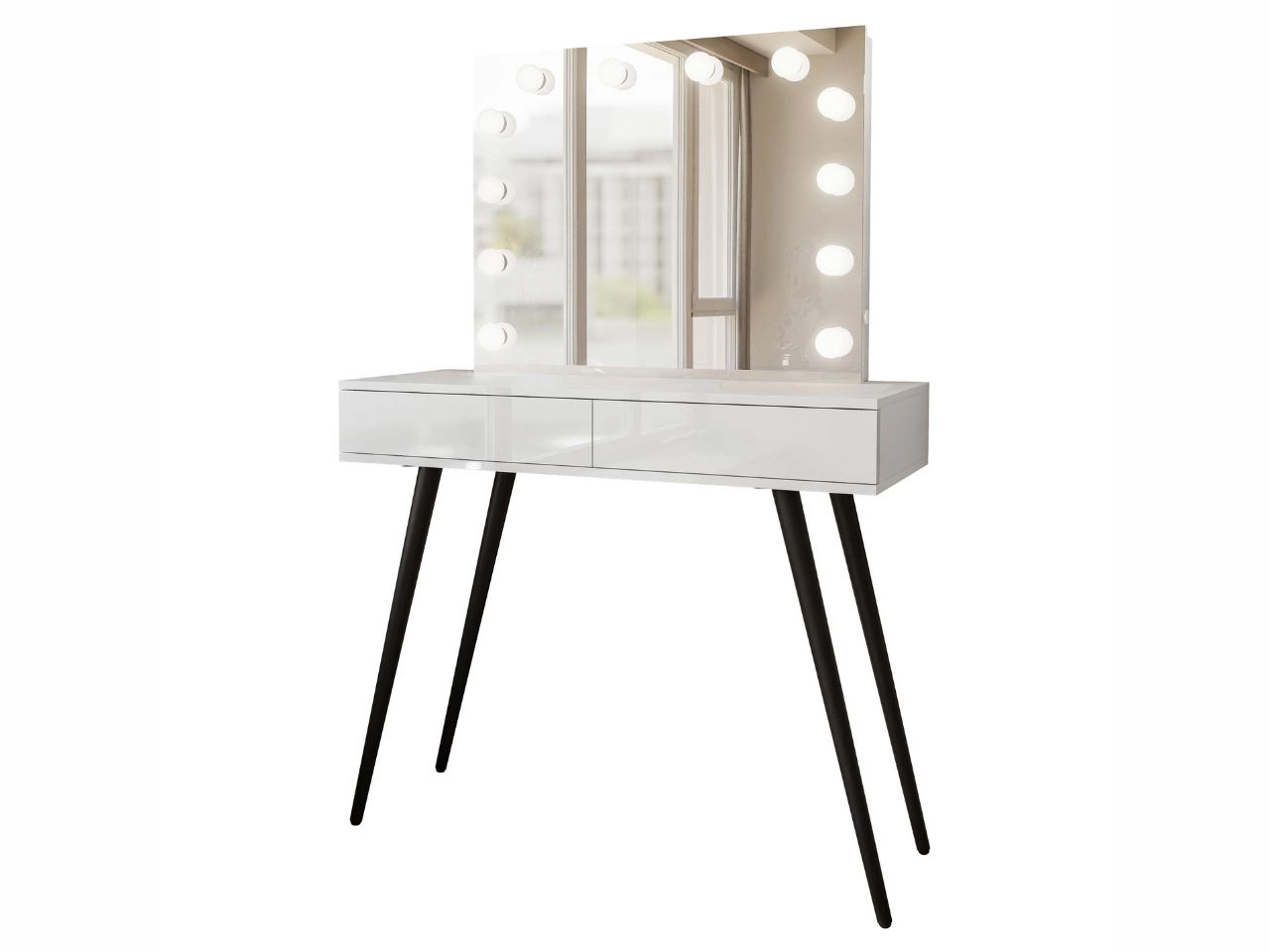 Toaletka kosmetyczna w stylu glamour z czarnymi nogami, lustrem i oświetleniem LED Olivine Elite biały połysk