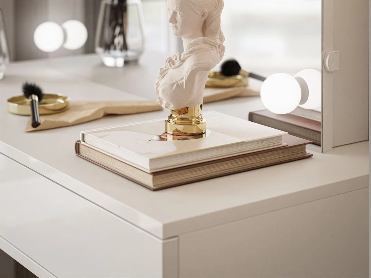 Funkcjonalność modelu podkreślają nowoczesne rozwiązania: lustro rozświetlają 12 punktów LED o naturalnej barwie przyjaznej dla oczu, zasilane z gniazdka za pomocą przewodu dołączonego do zestawu. Mebel wyposażono również w dwie szuflady otwierane w systemie PUSH TO OPEN, a pełny wysuw na prowadnicach kulkowych umożliwia łatwy i wygodny dostęp do przechowywanych akcesoriów. Aby toaletka Olivine Elite zachowała na długo swój idealny wygląd, jej obrzeża zabezpieczono okleiną ABS, chroniącą przed powstawaniem drobnych uszkodzeń mechanicznych i zarysowań.