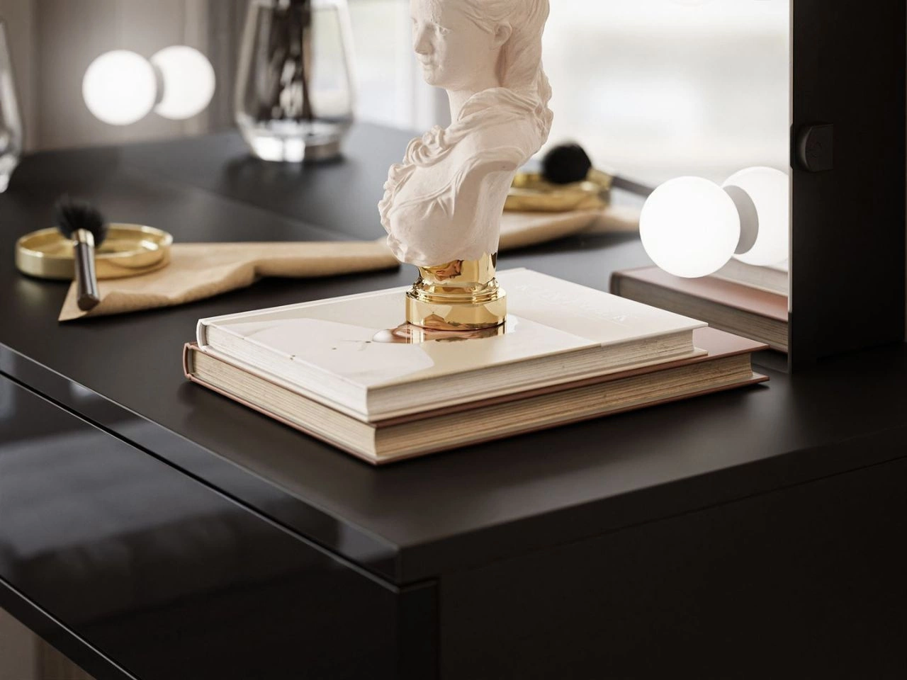 Toaletka Olivine Elite w czarnym połysku z lustrem i oświetleniem LED to elegancki mebel, który z łatwością odnajdzie się w różnorodnych aranżacjach wnętrz. Korpus oraz rama lustra wykonane zostały z matowej płyty laminowanej, a fronty pokryto efektownym wykończeniem w wysokim połysku. Stabilną konstrukcję wspierają złote, metalowe nogi, które nadają całości szyku i zapewniają trwałość.