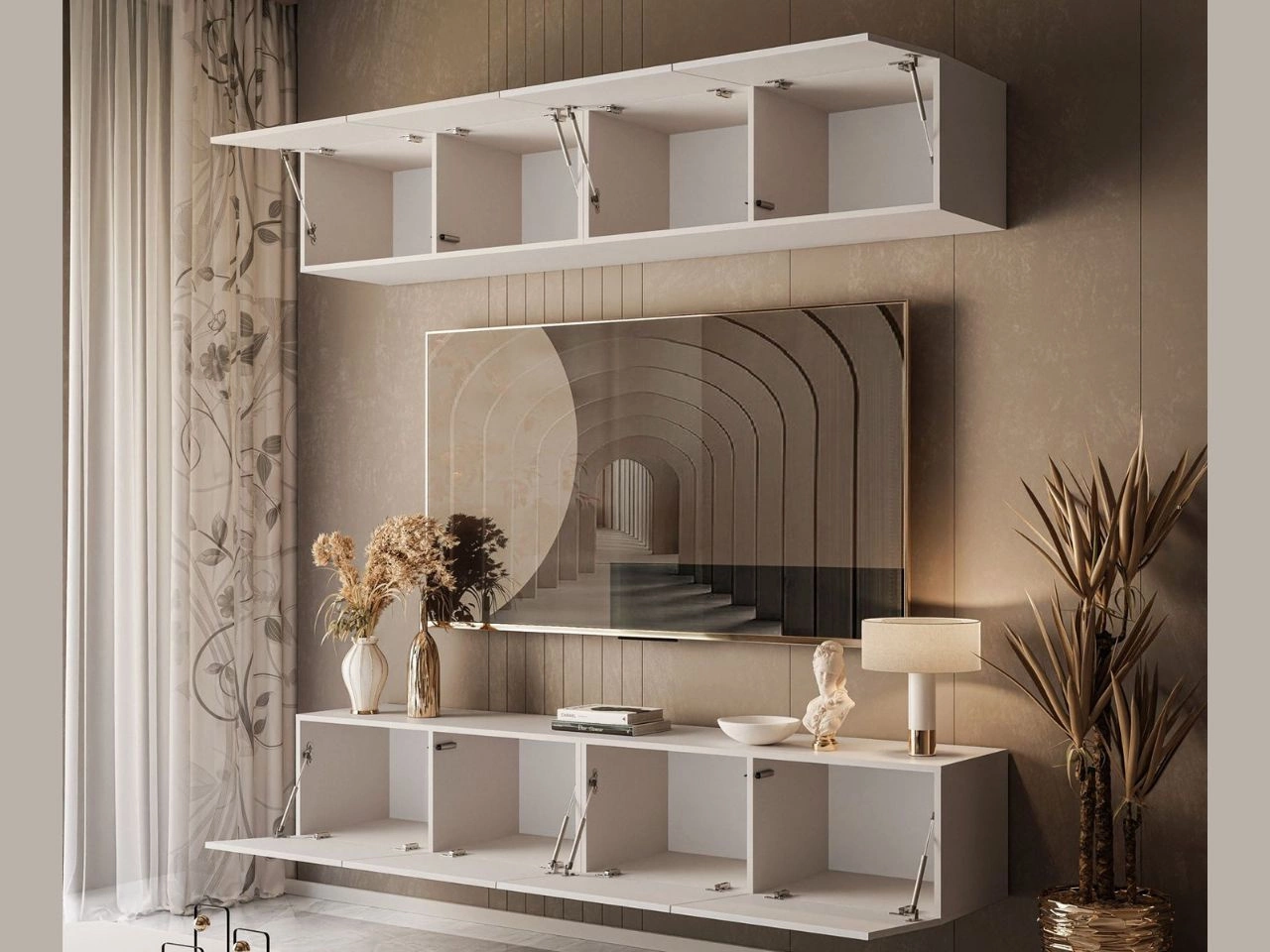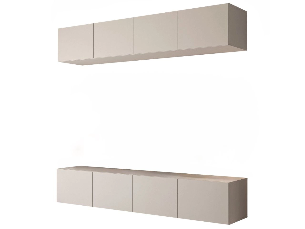 Meblościanka RTV oferuje dużo miejsca do przechowywania dzięki praktycznemu układowi. Zarówno górna, jak i dolna część meblościanki zostały podzielone na cztery pojemne wnęki, które zapewniają sporo miejsca na akcesoria RTV, książki czy dekoracje. Fronty w matowym wykończeniu wprowadzają do wnętrza lekkość i podkreślają nowoczesny, elegancki styl mebla.