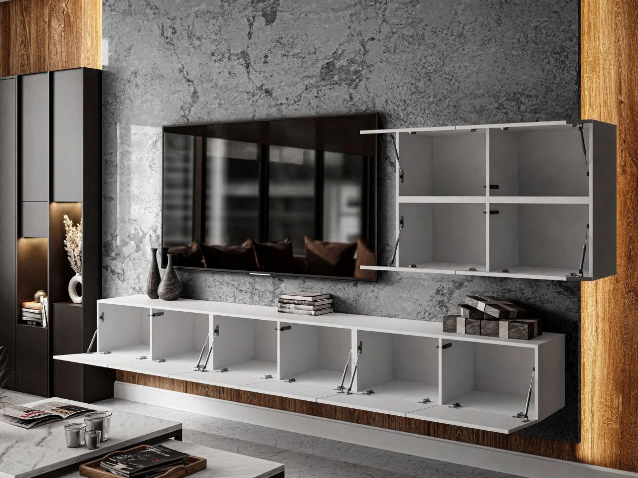 Meblościanka RTV wyróżnia się funkcjonalnością dzięki przemyślanemu układowi – dolna część została podzielona na cztery pojemne wnęki, a całość uzupełnia boczna szafka wisząca z czterema frontami, oferująca dodatkowe miejsce do przechowywania. Fronty w wysokim połysku nadają meblowi elegancji, optycznie powiększają przestrzeń i podkreślają jego nowoczesny charakter, dzięki czemu zestaw idealnie pasuje do każdego współczesnego salonu.