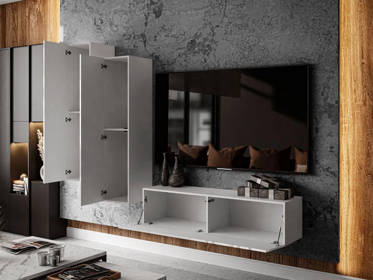 Wisząca meblościanka do salonu z oświetleniem LED Nodoo Biały połysk