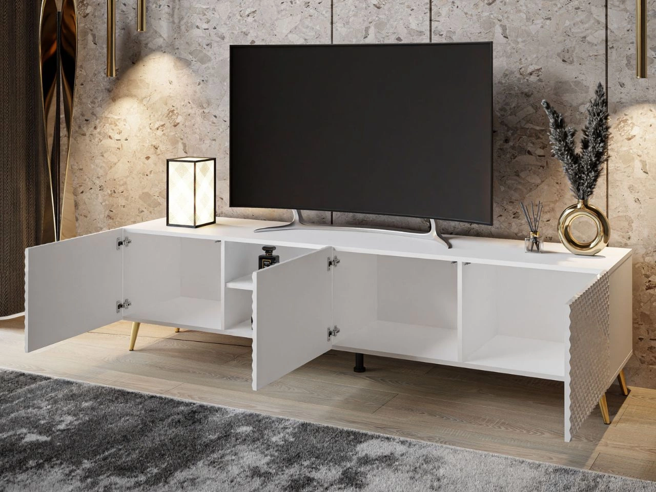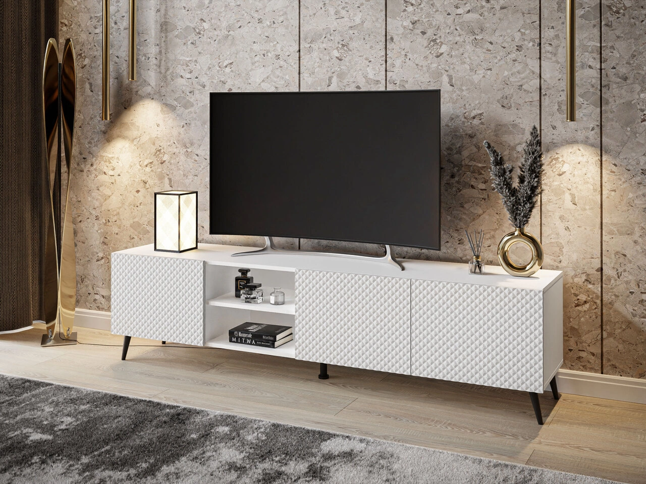 Szafka RTV z frezowanymi frontami 3D i metalowymi czarnymi nóżkami Celiane biały połysk