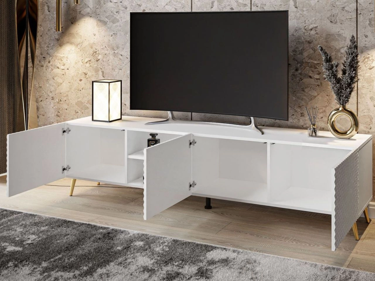 Szafka RTV z frezowanymi frontami 3D i metalowymi czarno-złotymi nóżkami Celiane biały połysk