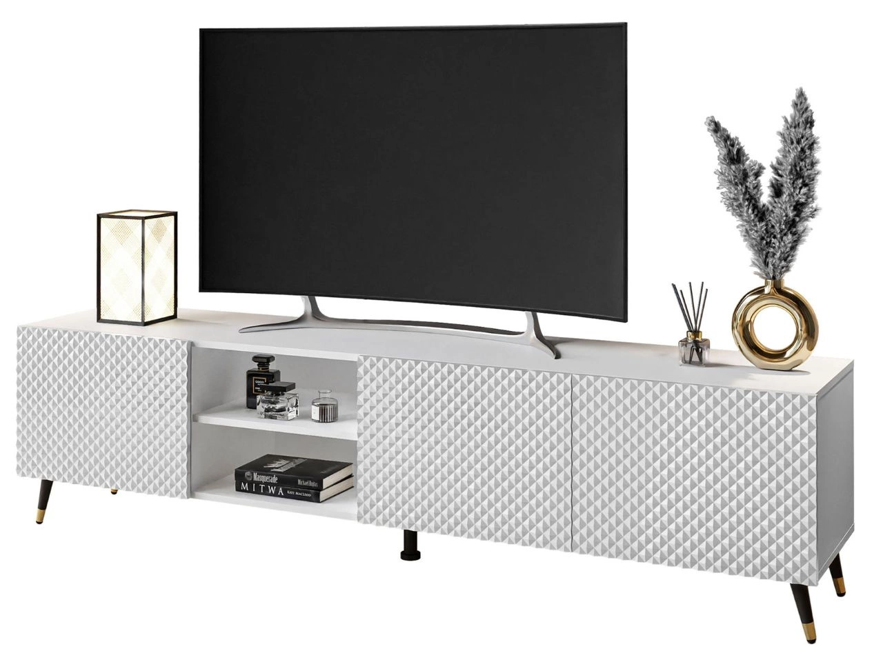 Dobierasz do: Szafka RTV z frezowanymi frontami 3D i metalowymi czarno-złotymi nóżkami Celiane biały połysk